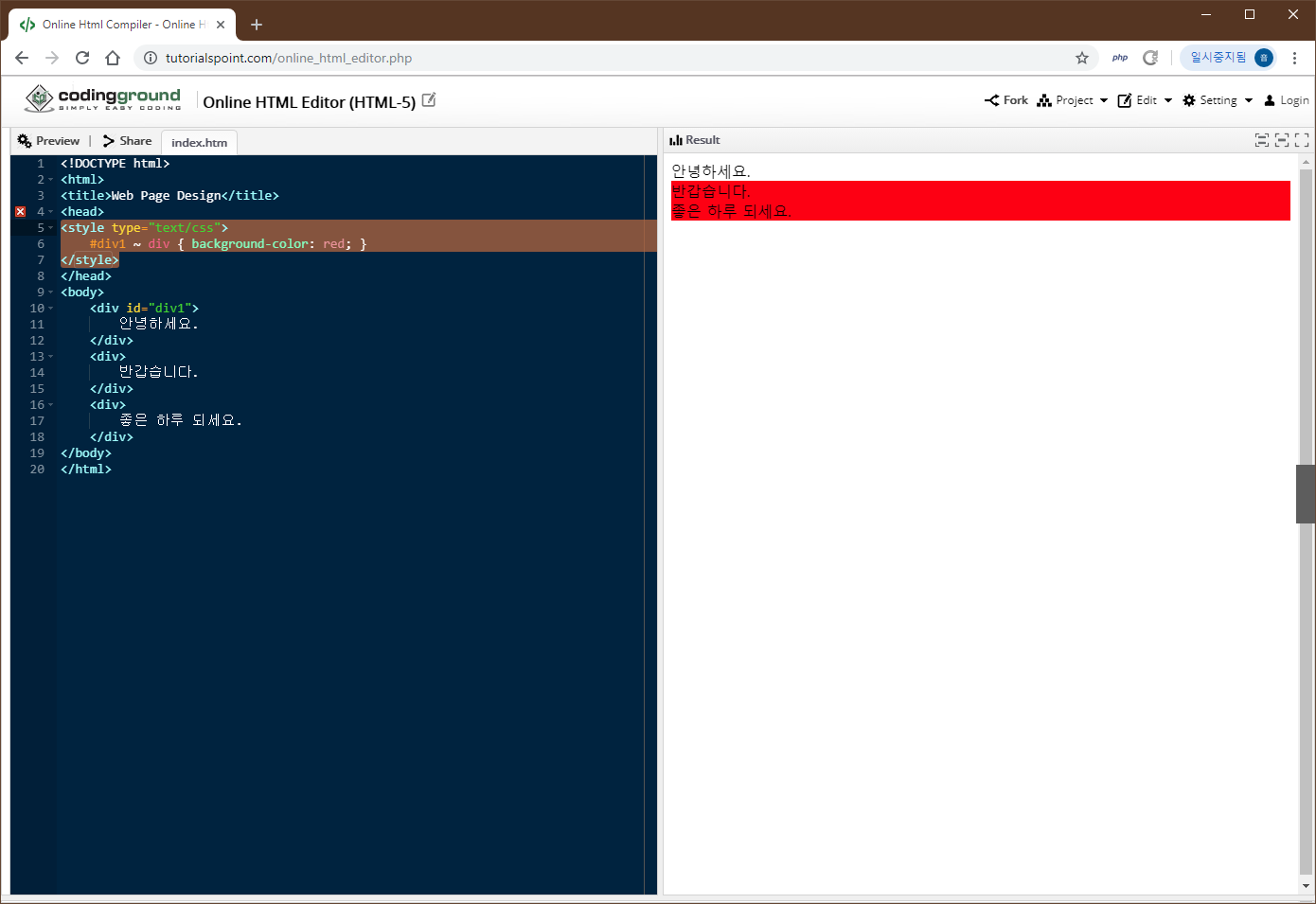 반면 ~기호를 사용하면 동율선상에서 뒤에 있는 모든 div 요소를 선택하게 됩니다.