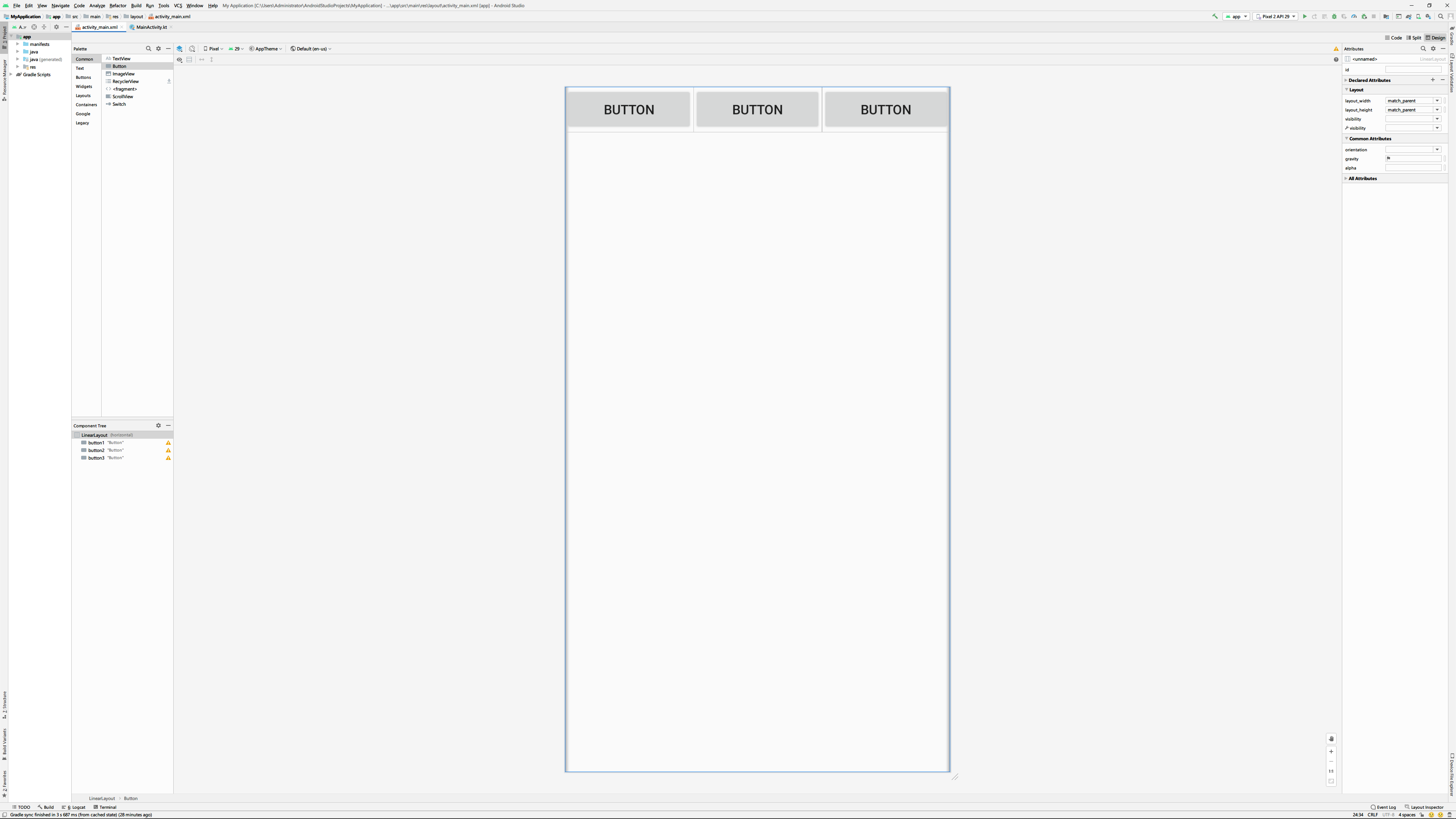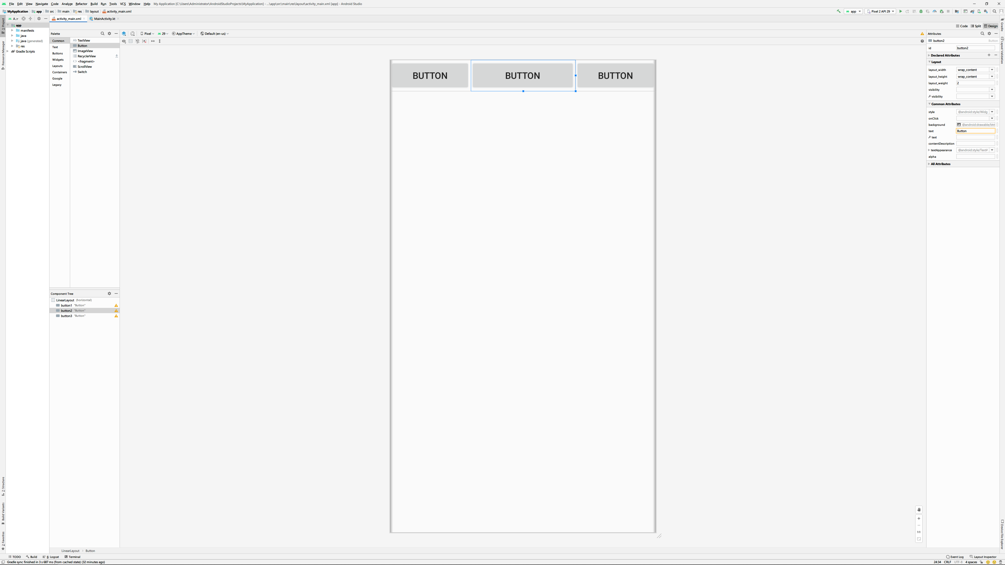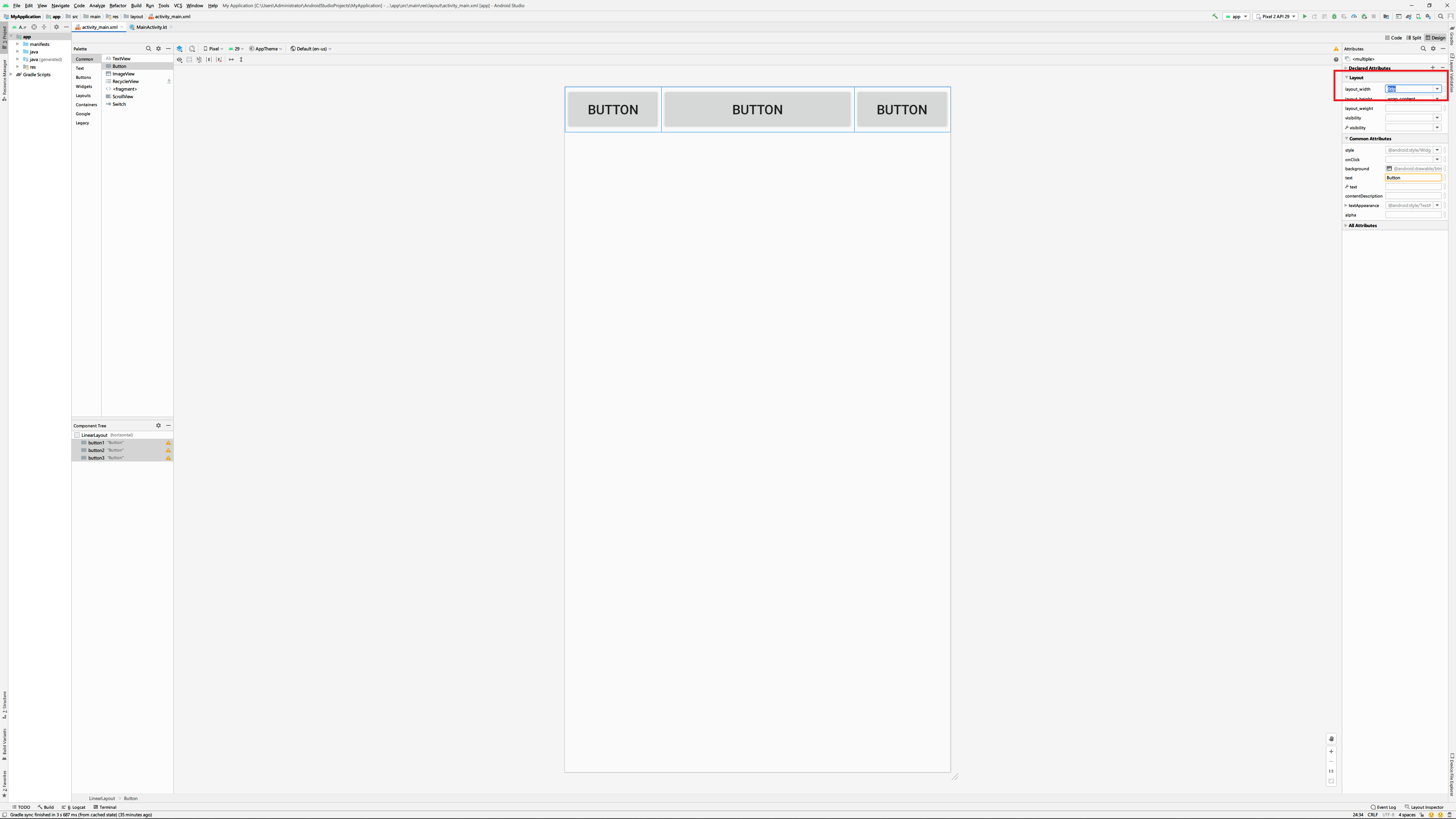 위젯이 배치된 상태에서 각각의 요소가 차지하는 공간비율을 변경하려면 layout_weight 속성값을 변경합니다. 각 요소의 layout_weight값은 따로 변경하지 않으면 기본값은 1입니다. 따라서 아래 화면처럼 버튼을 3개 배치하게 되면 각각의 버튼은 1:1:1 비율로 공간을 차지하게 됩니다.