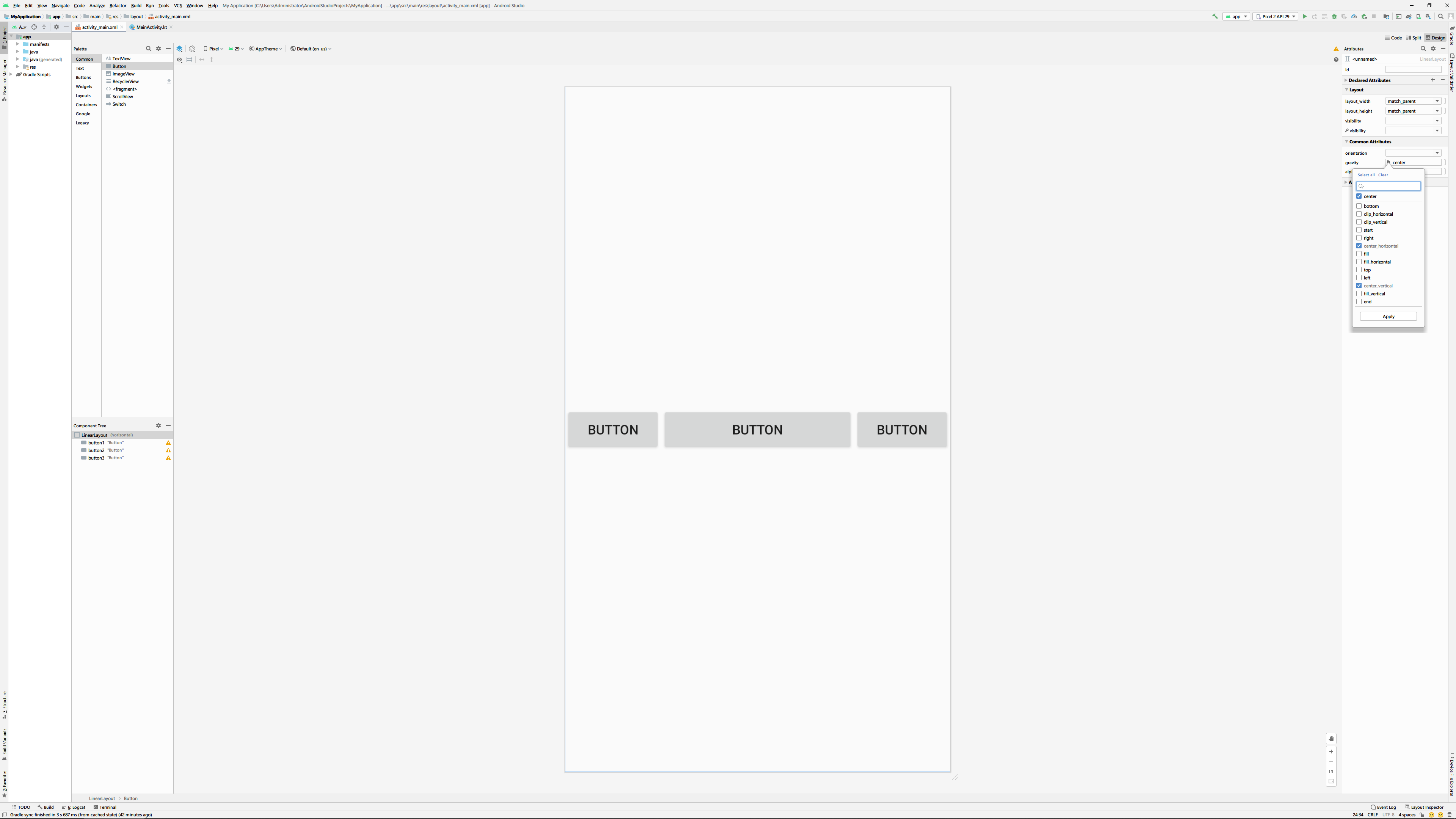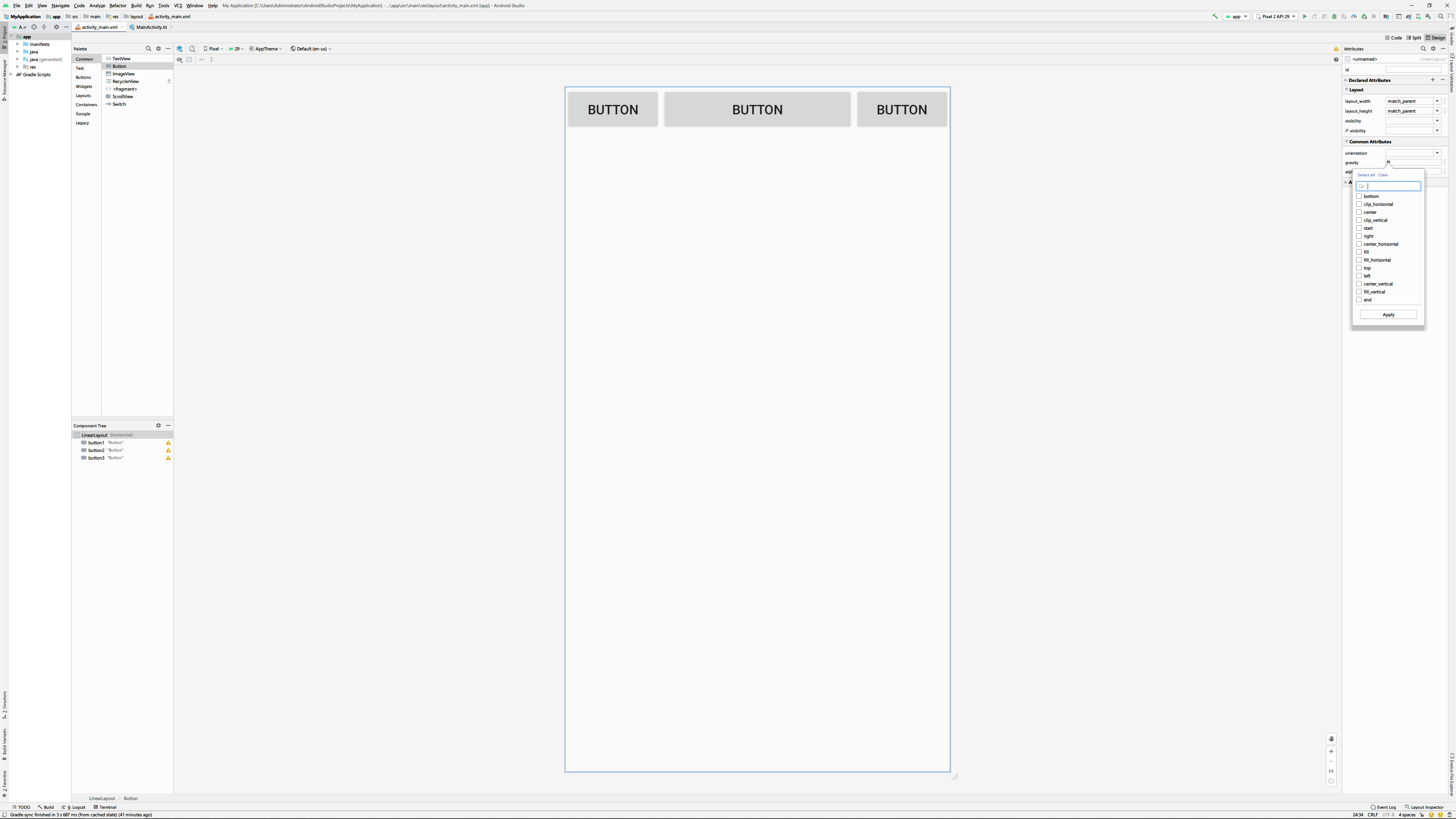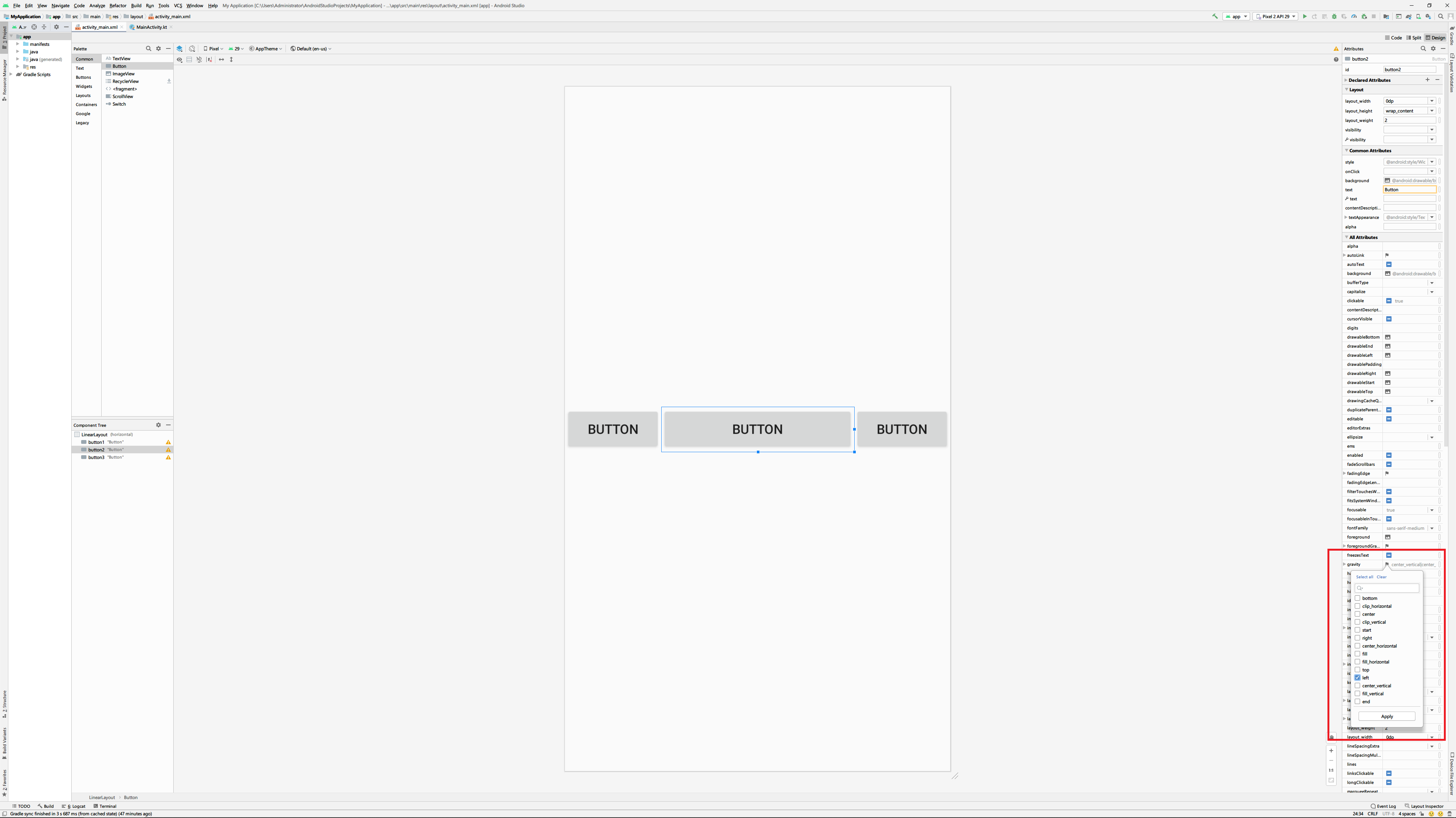 이 gravity 속성은 레이아웃 뿐만 아니라 각각의 위젯에서도 개별적으로 적용할 수 있습니다. 위젯에 이 속성을 적용하면 내부 컨텐츠의 정렬방식이 바뀌게 됩니다. 예를 들어 위 가운데 버튼의 개별 gravity속성을 left로 변경하면