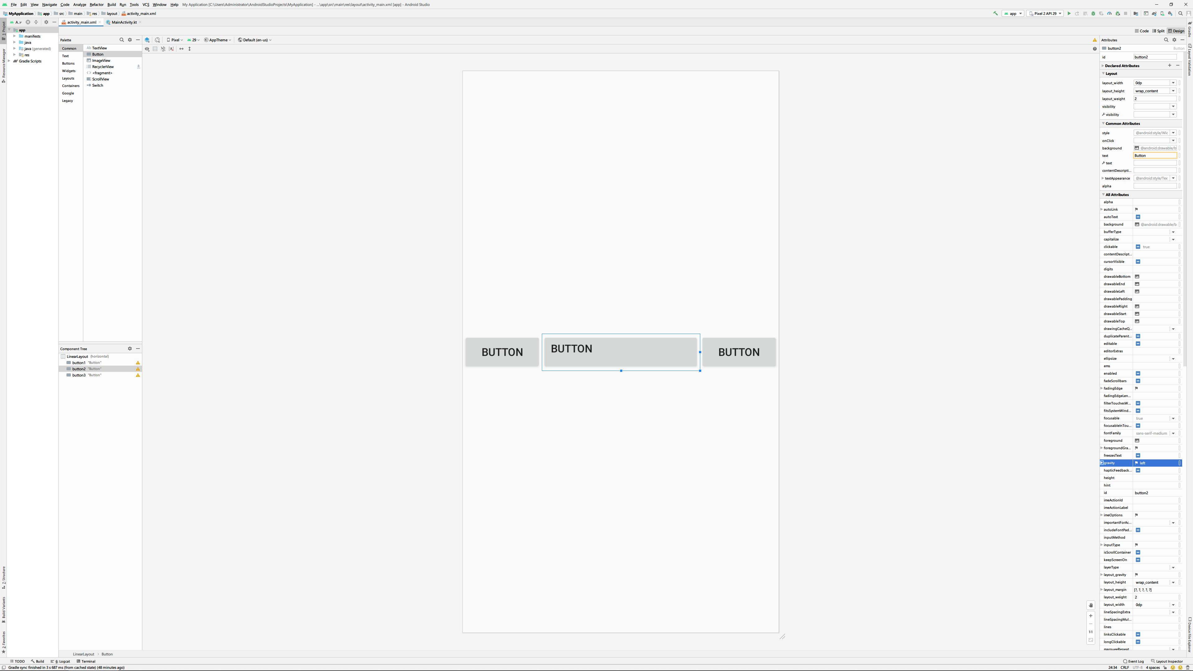 이 상태에서 가운데 버튼의 비율을 바꾸기 위해 가운데 버튼의 layout_weight값을 2로 변경해 보겠습니다.