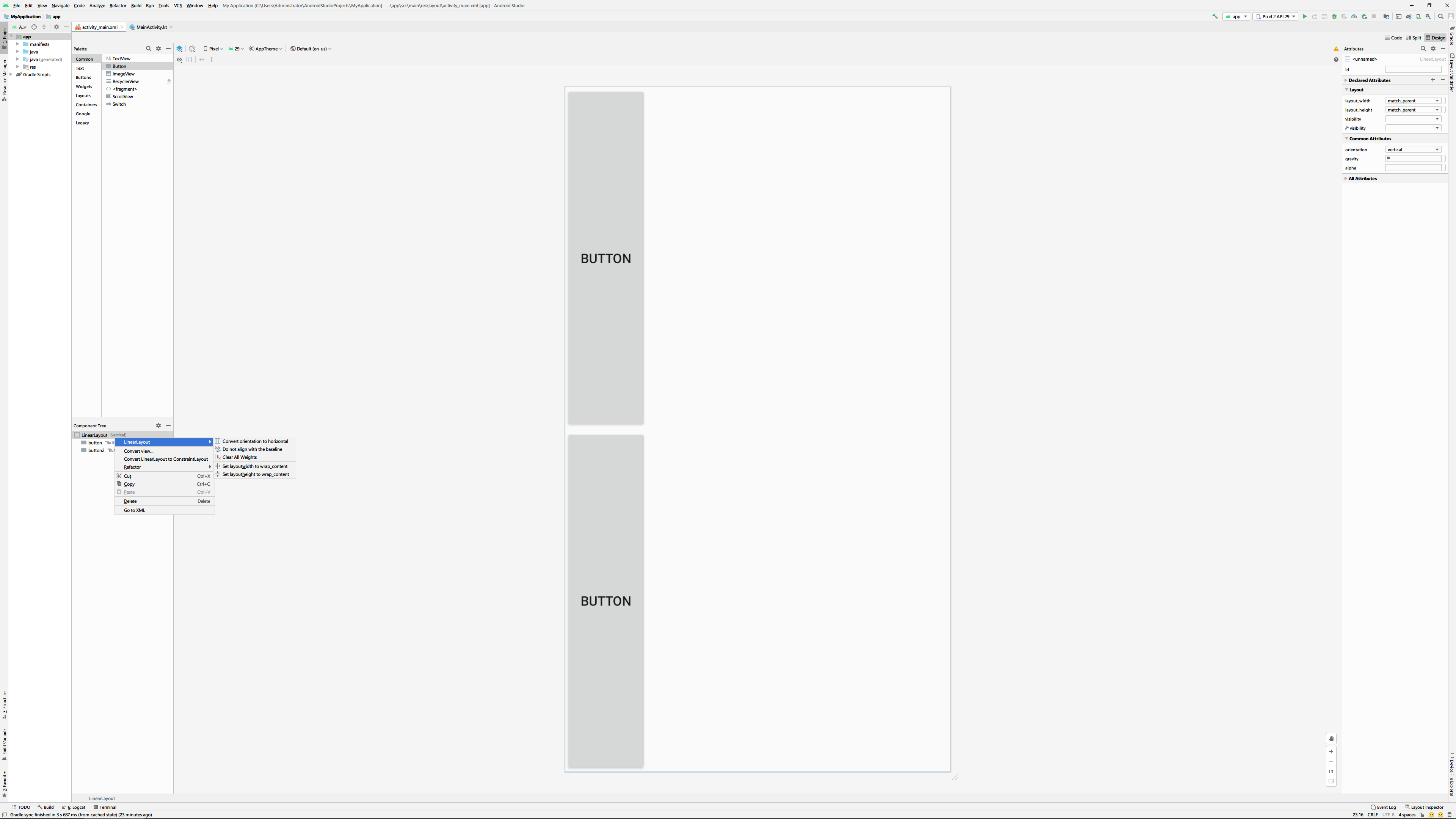 각 방향에 대한 전환은 컴포넌트 트리의 레이아웃에서 마우스 오른쪽 버튼을 눌러 'LinearLayout -> Convert orientation to [방향]'을 선택하면 됩니다.
