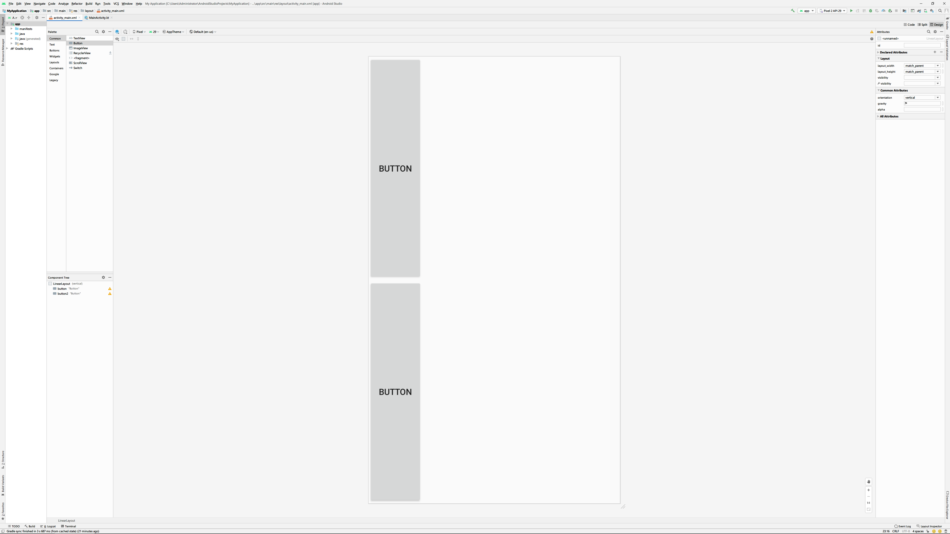 리니어 레이아웃은 위젯을 가로 혹은 세로로 배치하기 위한 레이아웃입니다. 각각의 레이아웃에서는 사용가능한 설정이 상당히 많고 모든걸 다 알 수 없기 때문에 여기서는 간단히 어떤 용도로 사용한다는 정도만 알고자 합니다. 이 레이아웃을 사용하기 위해서는 기존 레이아웃을 아래와 같이 변경하거나