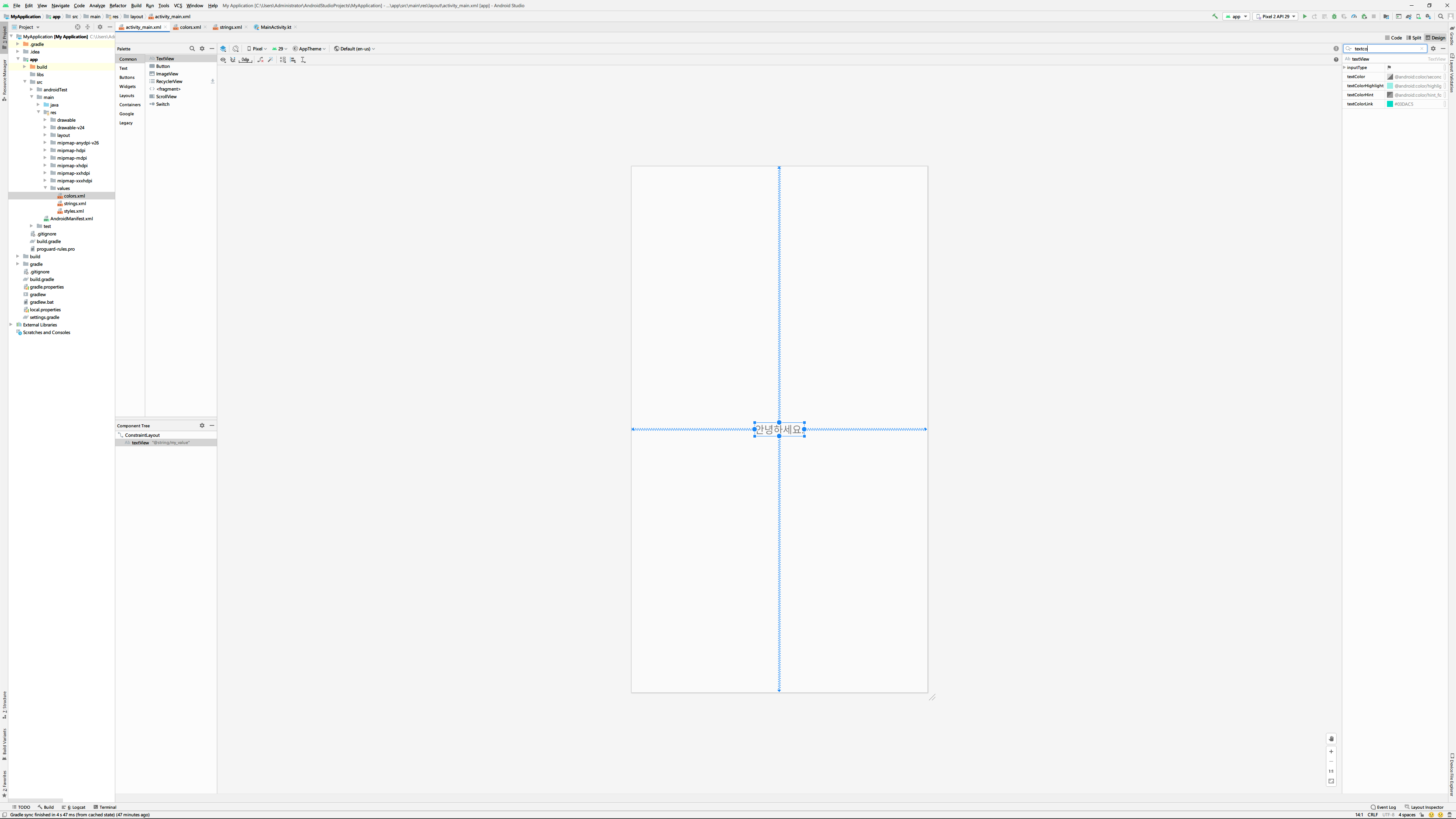 혹은 text속성에 바로 '@string/my_value'처럼 값을 입력할 수도 있습니다. 여기서 my_value는 조금 전에 resource에 추가할 때 사용한 ID와 같은 값입니다.