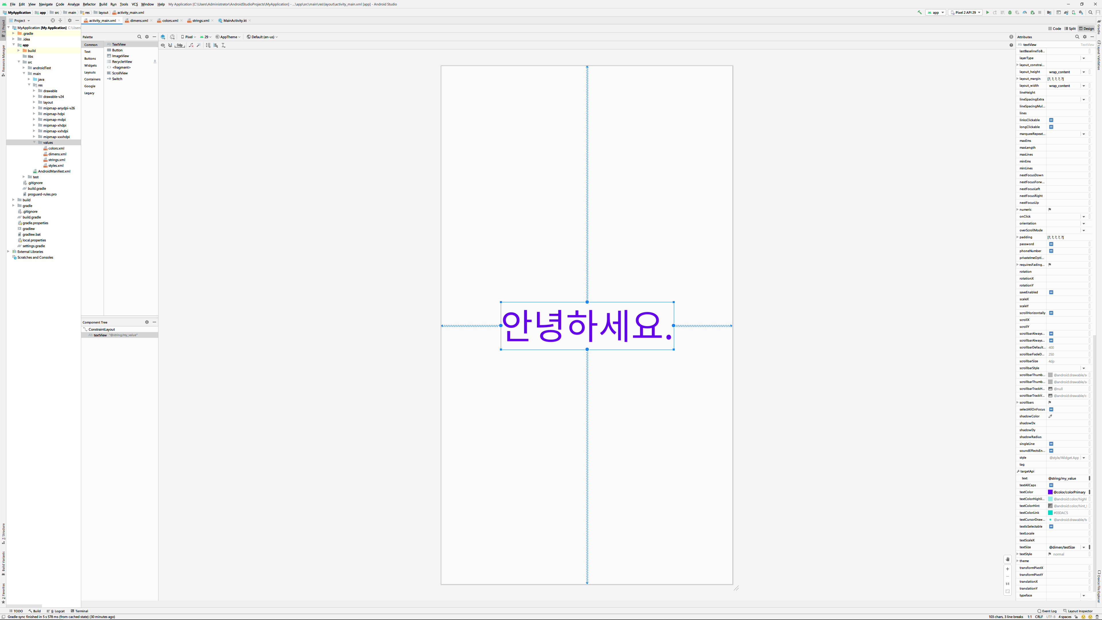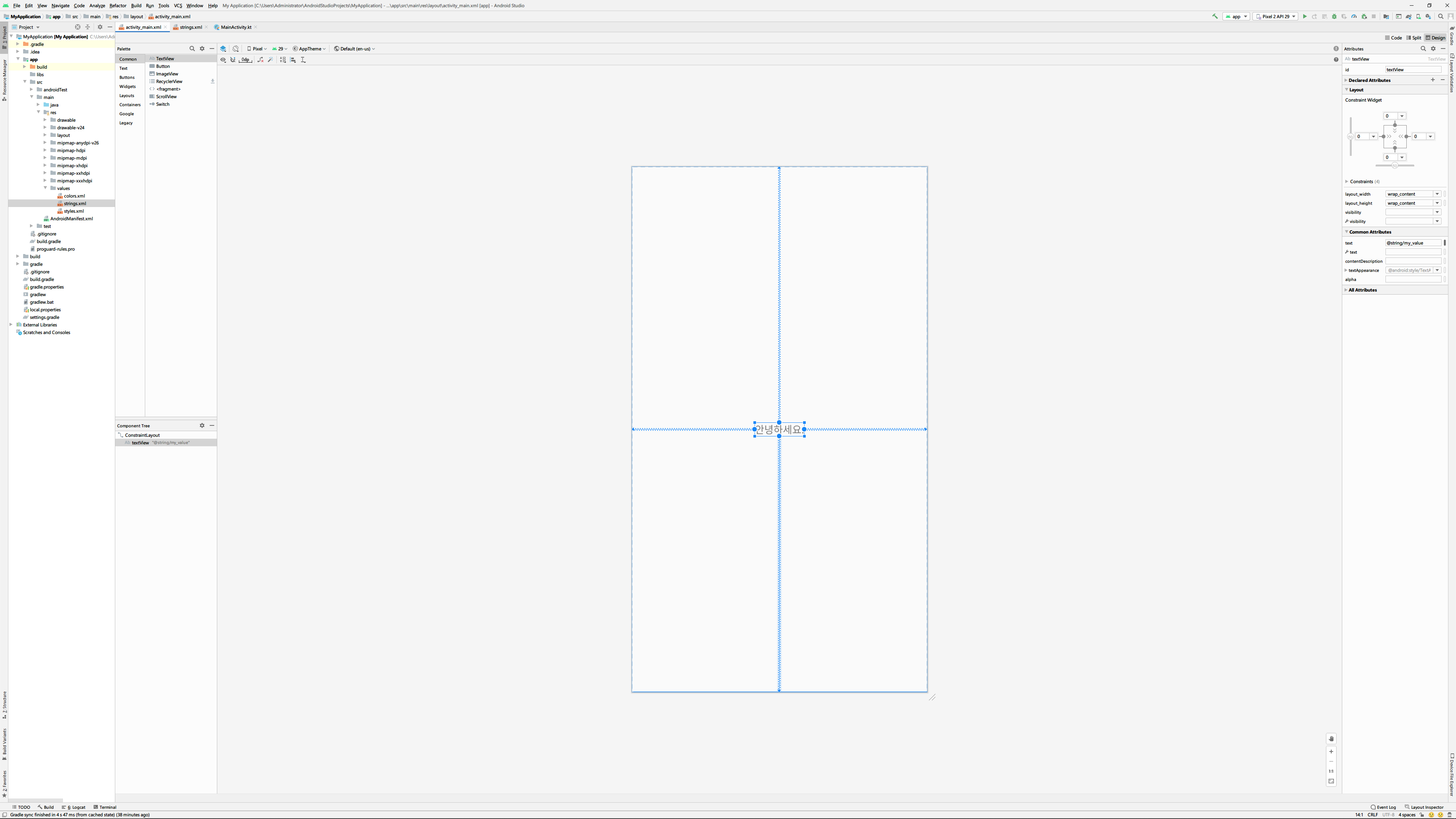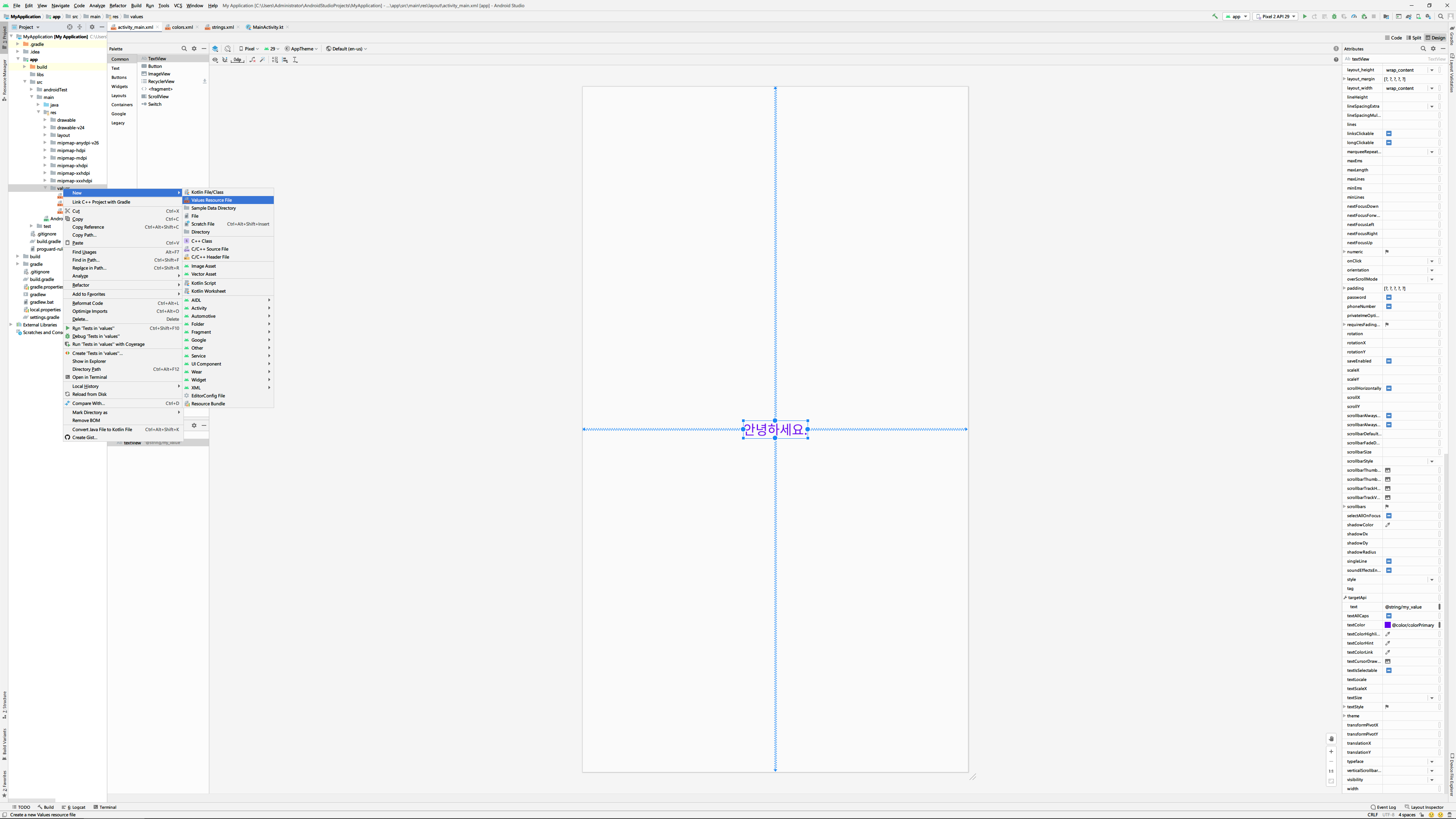 혹은 text속성에 바로 '@string/my_value'처럼 값을 입력할 수도 있습니다. 여기서 my_value는 조금 전에 resource에 추가할 때 사용한 ID와 같은 값입니다.