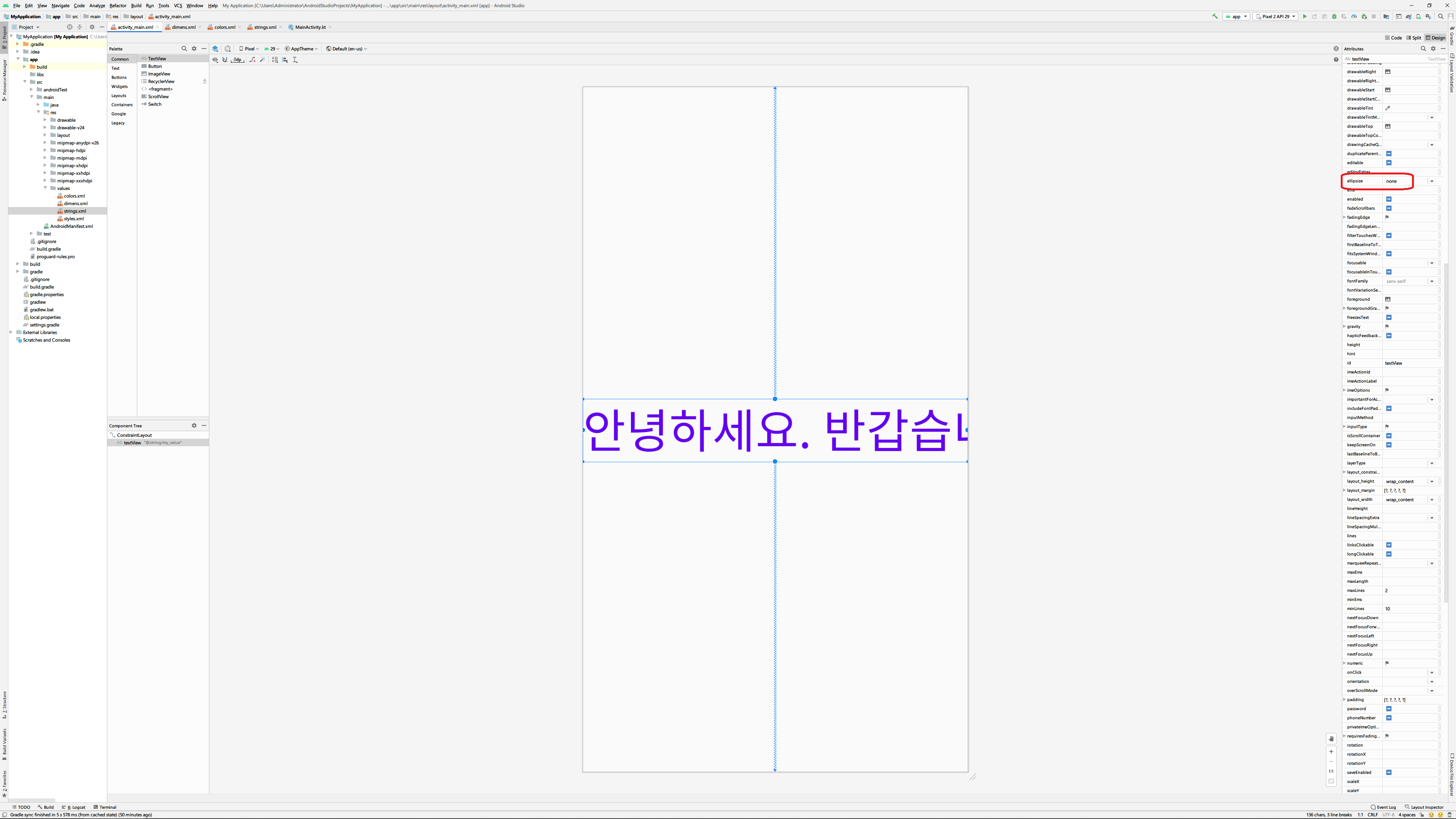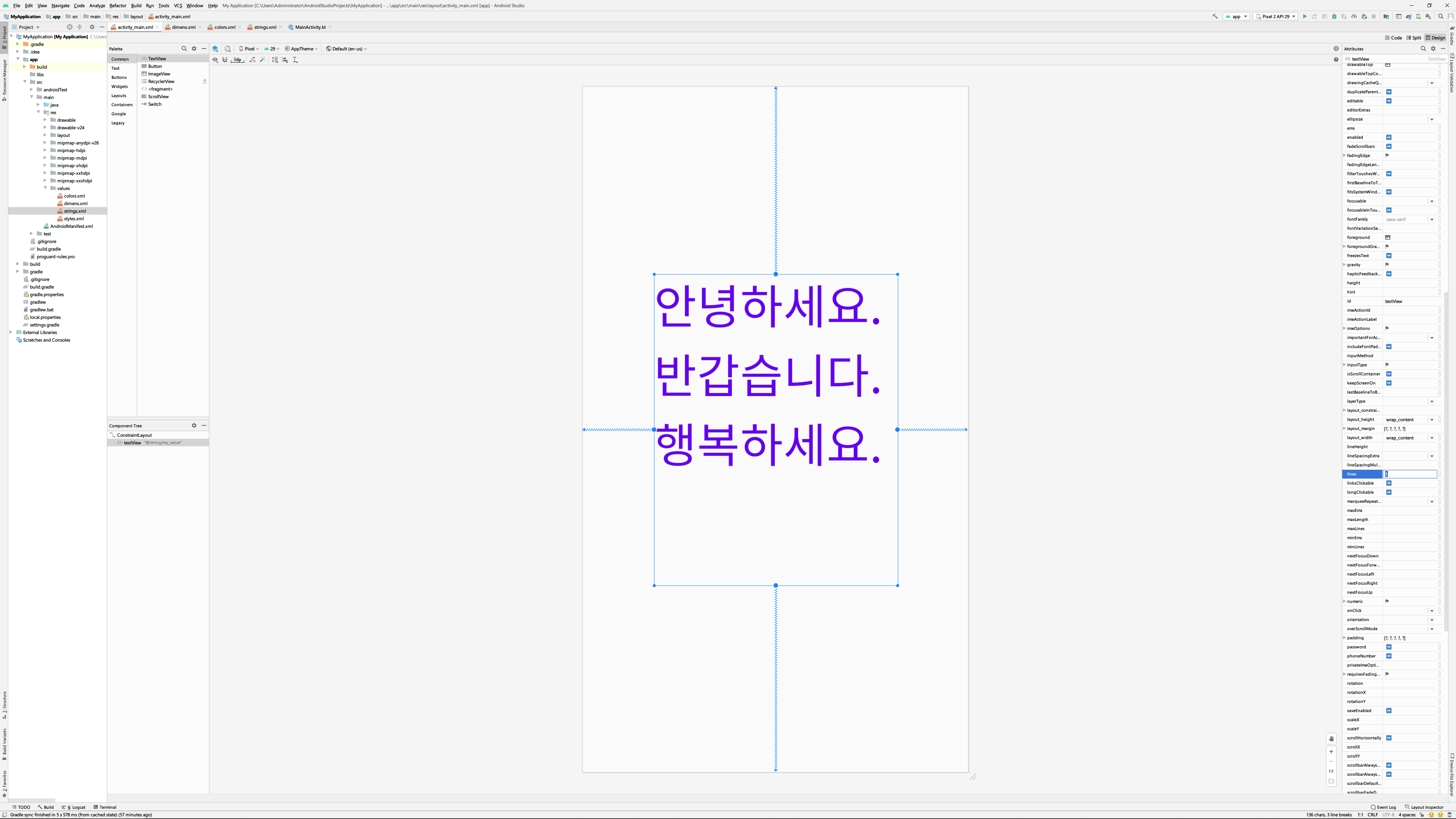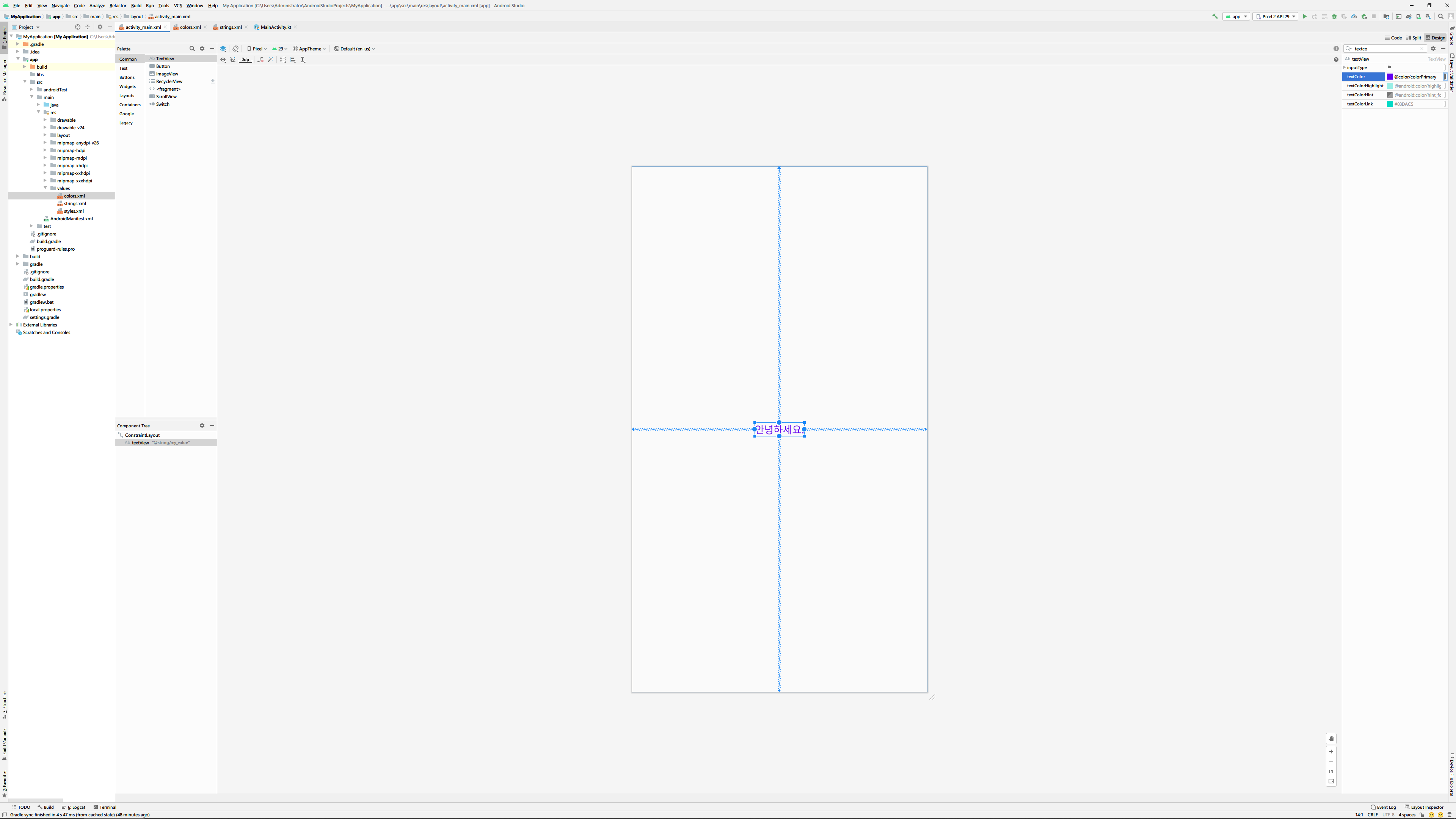 혹은 text속성에 바로 '@string/my_value'처럼 값을 입력할 수도 있습니다. 여기서 my_value는 조금 전에 resource에 추가할 때 사용한 ID와 같은 값입니다.
