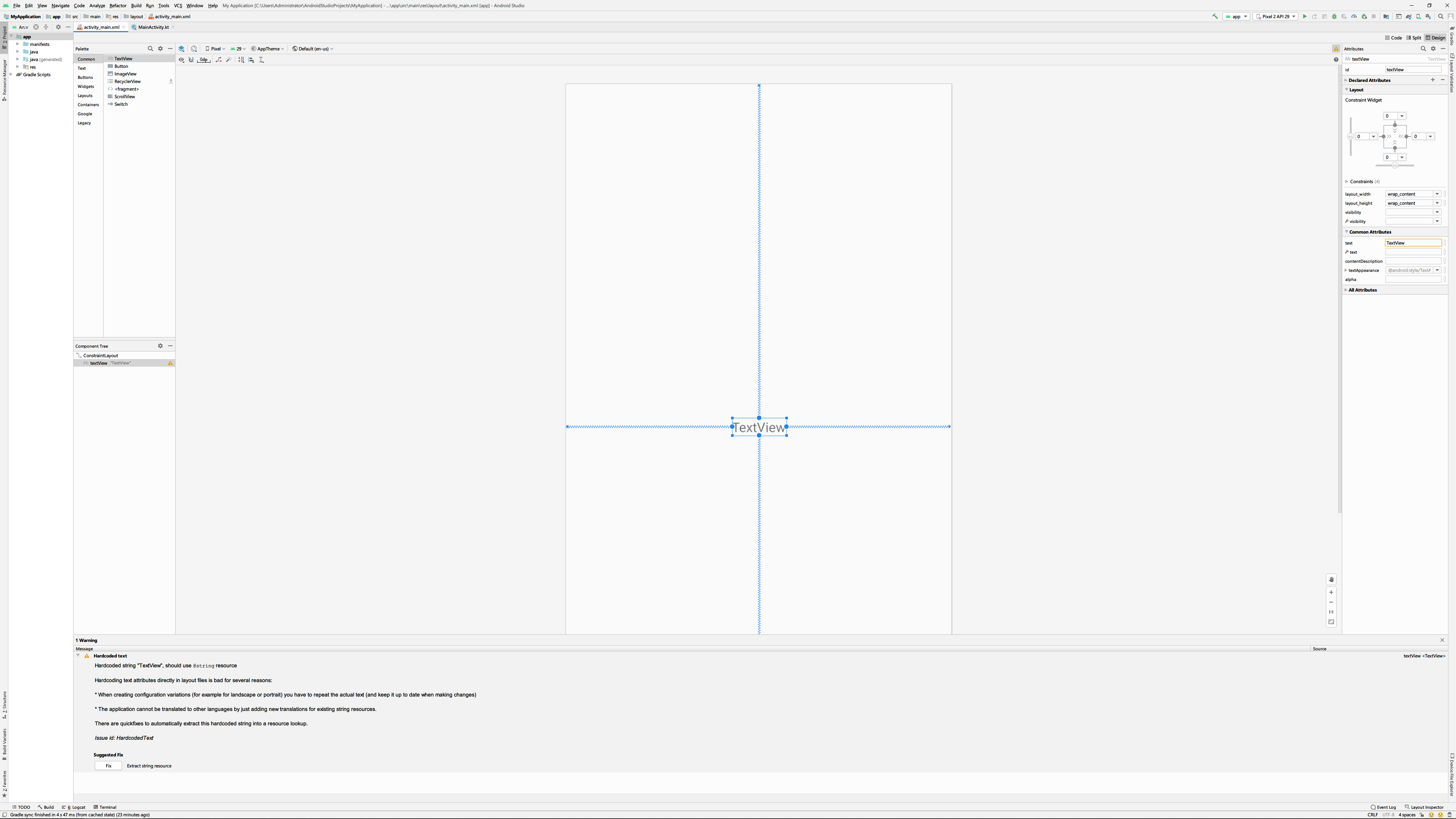텍스트뷰는 텍스트를 화면에 표시하는 위젯입니다. 처음 위젯을 올려놓고 보면 아래와 같은 경고를 볼 수 있는데