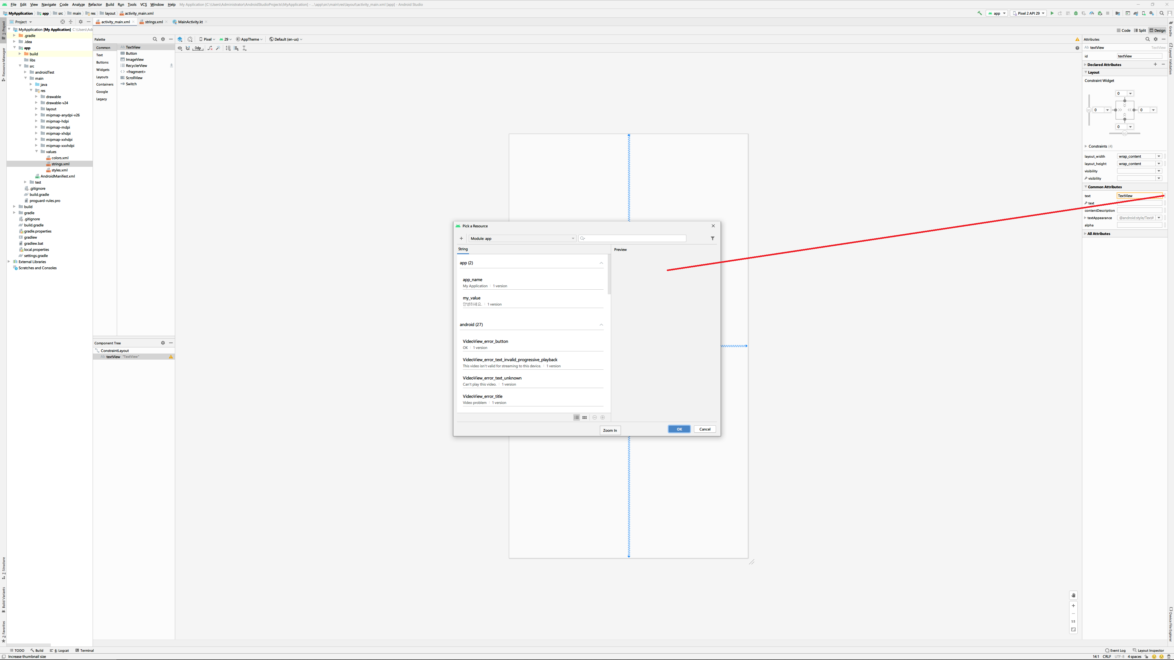그리고 디자인 화면으로 돌아와 위에서 추가한 TextView위젯을 선택하고 text속성 옆에 작은 버튼을 눌러주면 사용 가능한 텍스트 리소스 목록이 나타나게 되는데