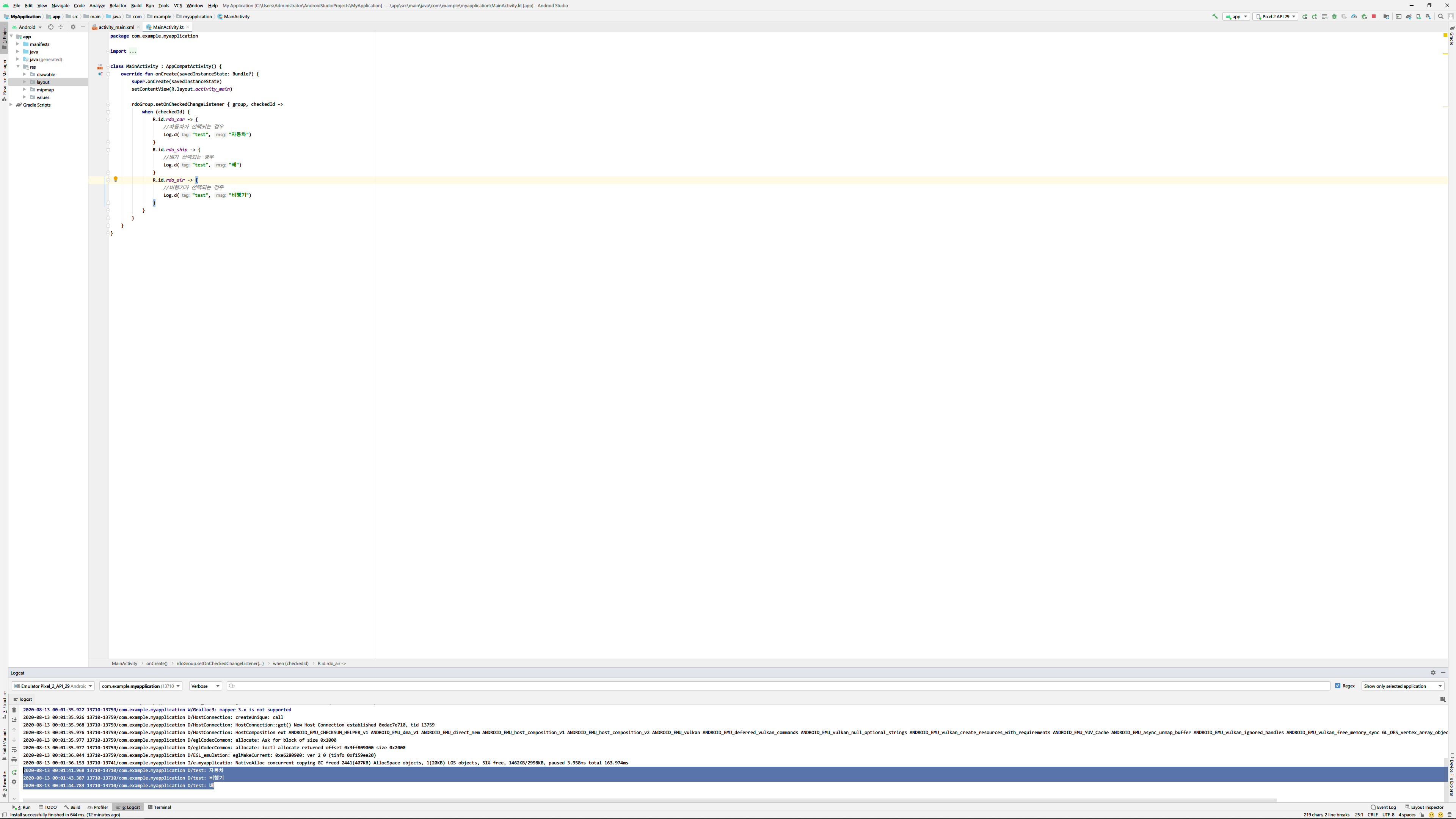 이제 앱을 빌드하고 실행하면 사용자가 RadioButton을 선택하는 경우에 따라 when분기에 의해 각각의 처리로 이동하게 됩니다.