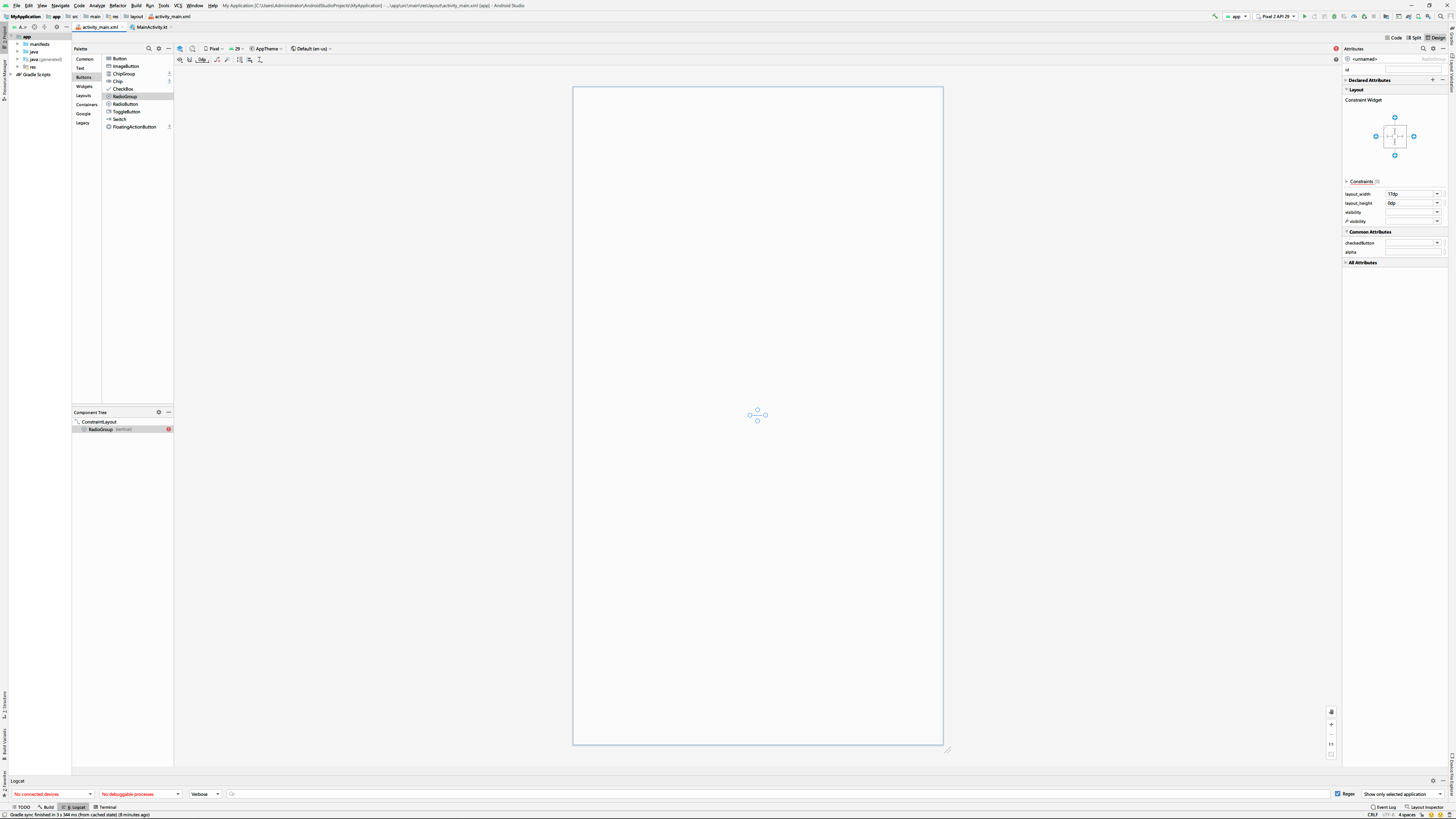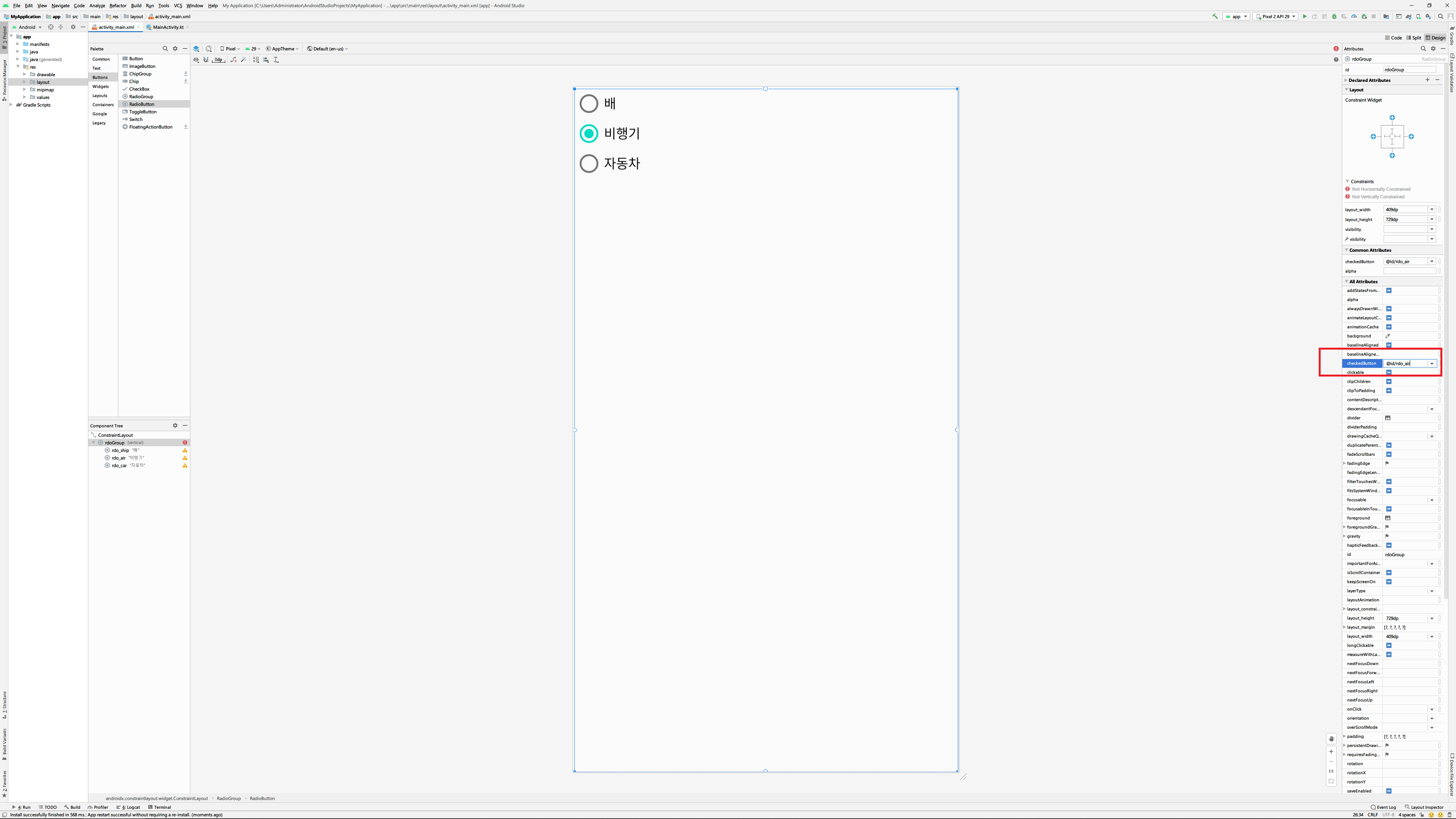 RadioGroup을 사용하기 위해 위젯을 디자인영역에 끌어다 놓으면 위와 같은 그림을 볼 수 있습니다. 이 상태에서 RadioButton을 방금 추가한 RadioGroup위에다가 끌어다 놓은 후 RadioGroup의 ID는 rdoGroup로 변경하고 그 안에 추가한 RadioButton의 ID는 각각 rdo_car, rdo_air, rdo_ship로, text는 자동차, 비행기, 배로 설정합니다.