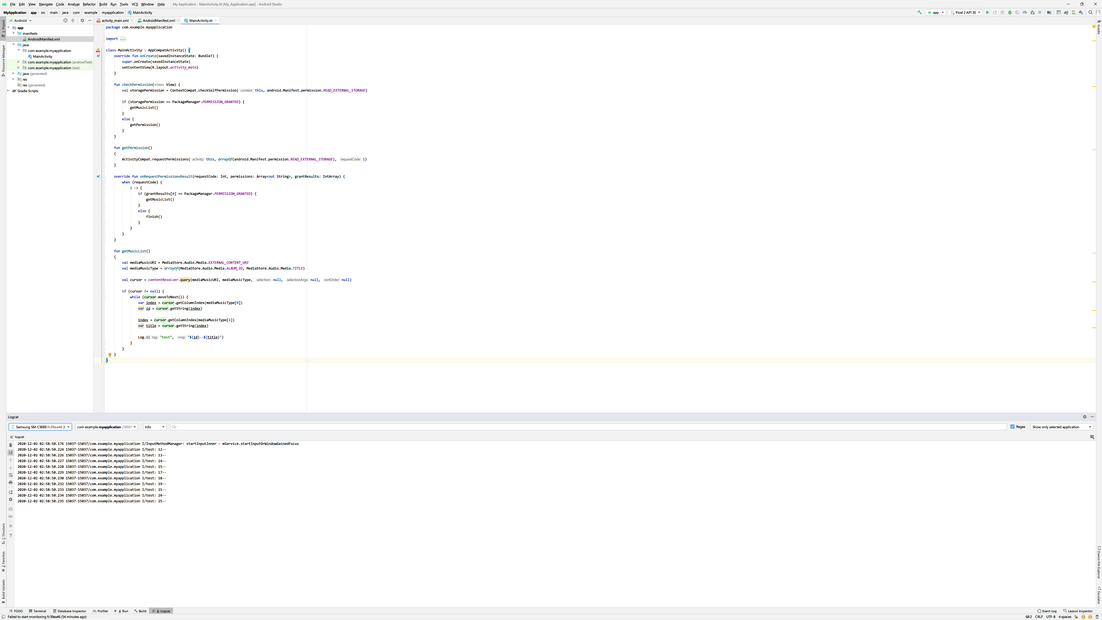 앱을 실행하고 버튼을 누르면 권한 요청이 표시되고 권한을 허용하면 정상적으로 음악의 목록이 표시됨을 확인할 수 있습니다.