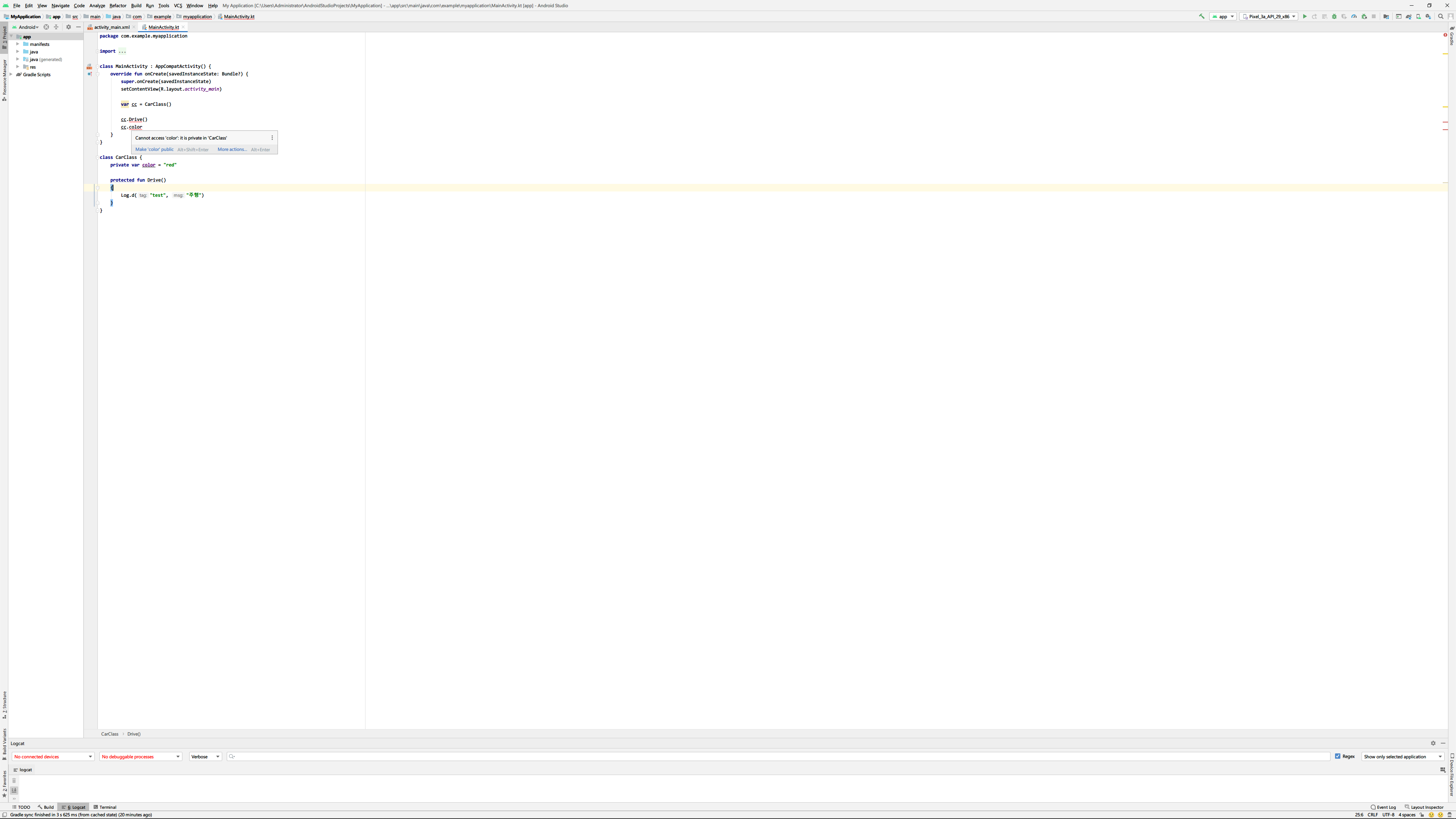 사실 위에 있는 클래스는 아무런 접근제한자도 설정되어 있지 않은 상태인데 코틀린에서는 만약 접근 제한자를 설정하지 않으면 기본적으로 public처리됩니다. public은 외부에서 자유롭게 접근이 가능한 상태를 의미합니다.