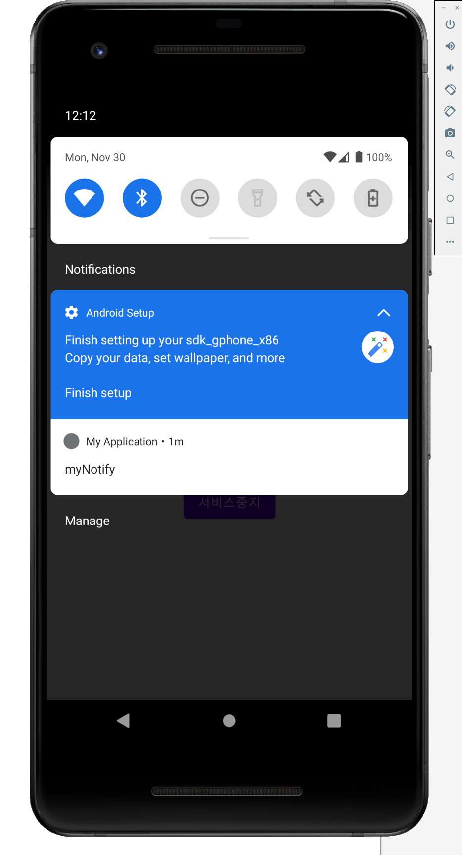 앱을 동작시켜 '서비스실행'버튼을 누르면 상태바에 설정한 알림이 표시되는 걸 확인할 수 있습니다.