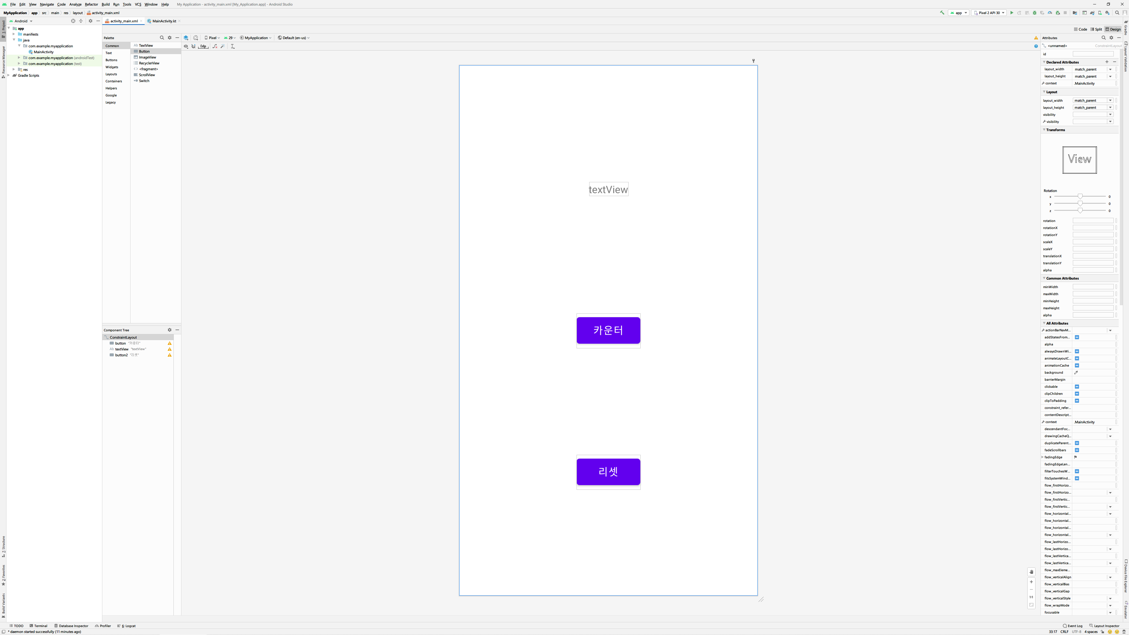 그럼 1초마다 숫자를 늘려 카운트하는 예제를 통해서 직접 핸들러를 구현해 보도록 하겠습니다. 우선 아래와 같이 화면을 구성합니다. 버튼 2개와 TextView하나를 배치하였습니다. 버튼의 ID는 카운터는 button 리셋은 button2이며, TextView의 ID는 textView입니다.