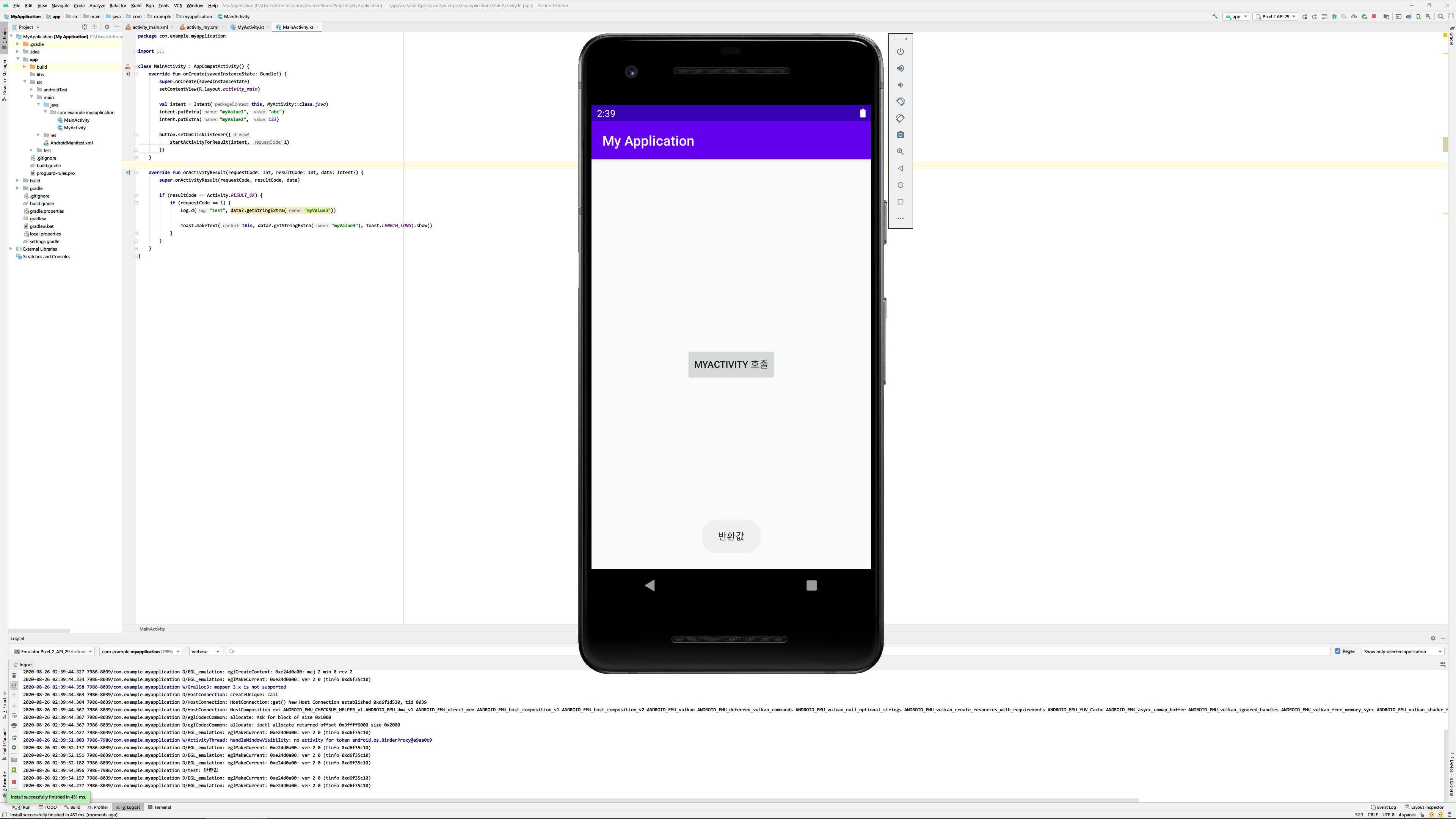 위 코드를 조금전 새롭게 추가한 MyActivity의 onCreate 메서드 안에 작성합니다. intent자체는 이미 Activity가 호출될 때 전달되는 것이므로 별다른 선언 없이 곧장 사용할 수 있으며 getStringExtra함수를 통해 문자열 형태의 값을 받도록 합니다.
