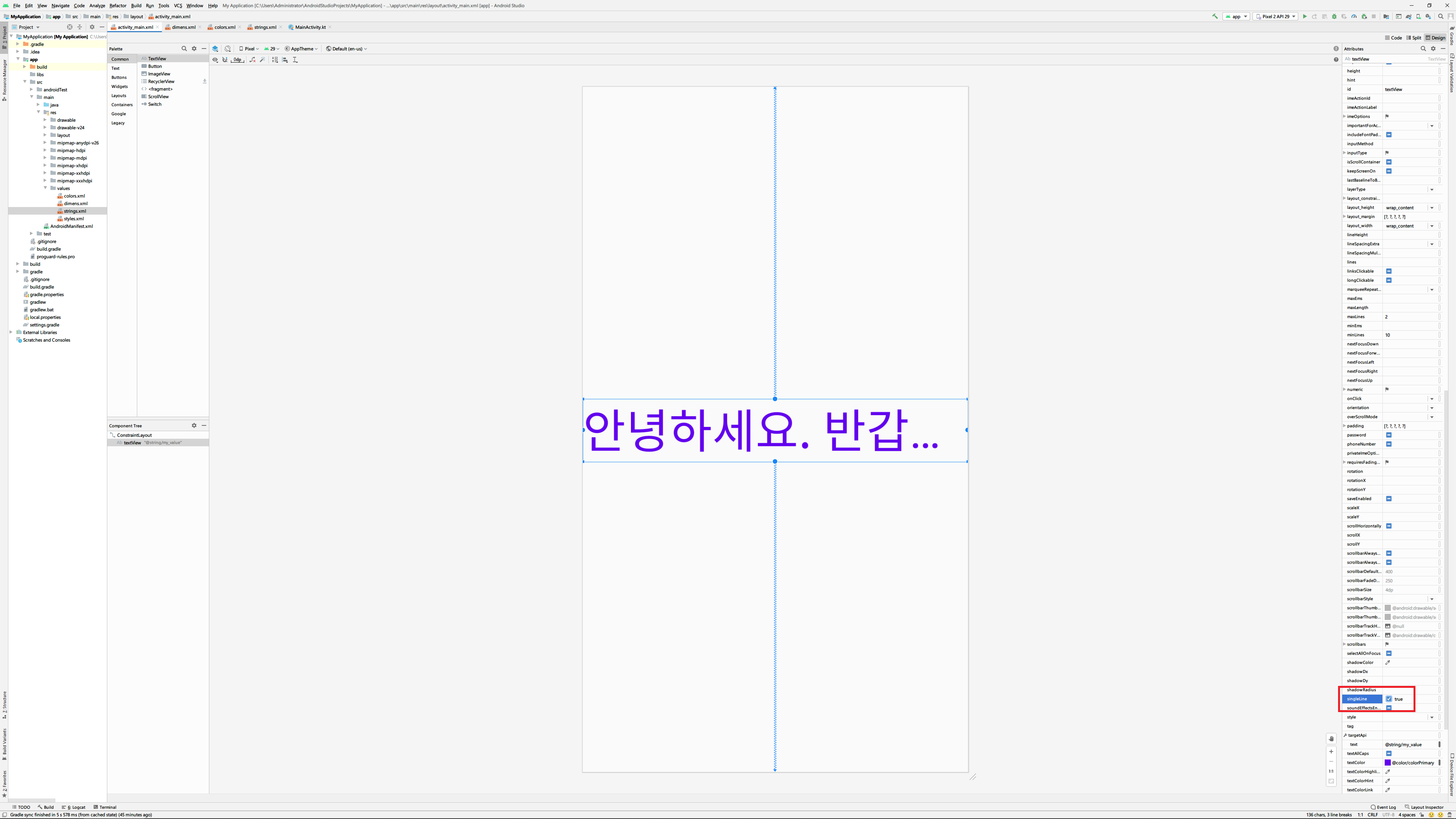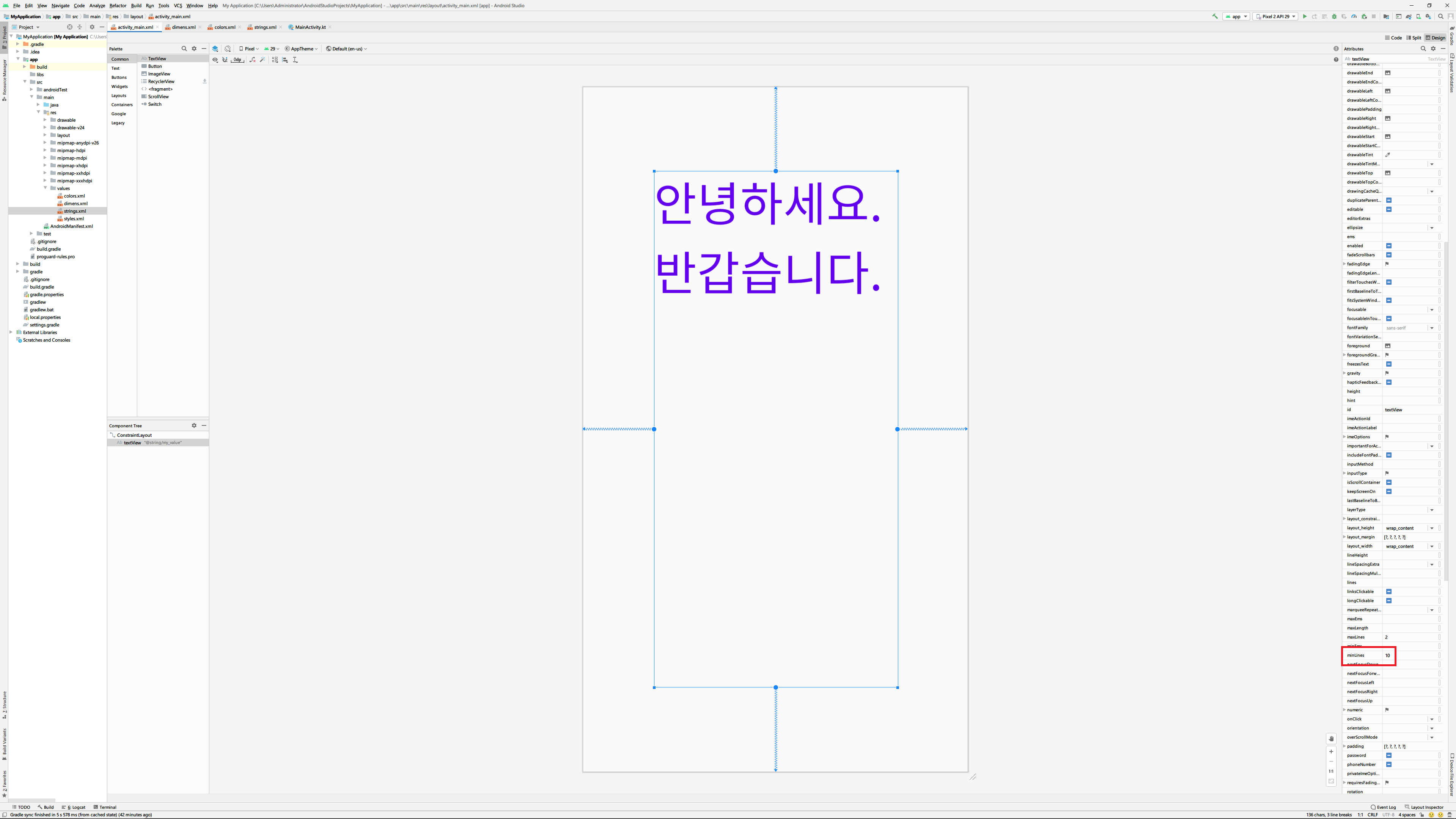 혹은 text속성에 바로 '@string/my_value'처럼 값을 입력할 수도 있습니다. 여기서 my_value는 조금 전에 resource에 추가할 때 사용한 ID와 같은 값입니다.