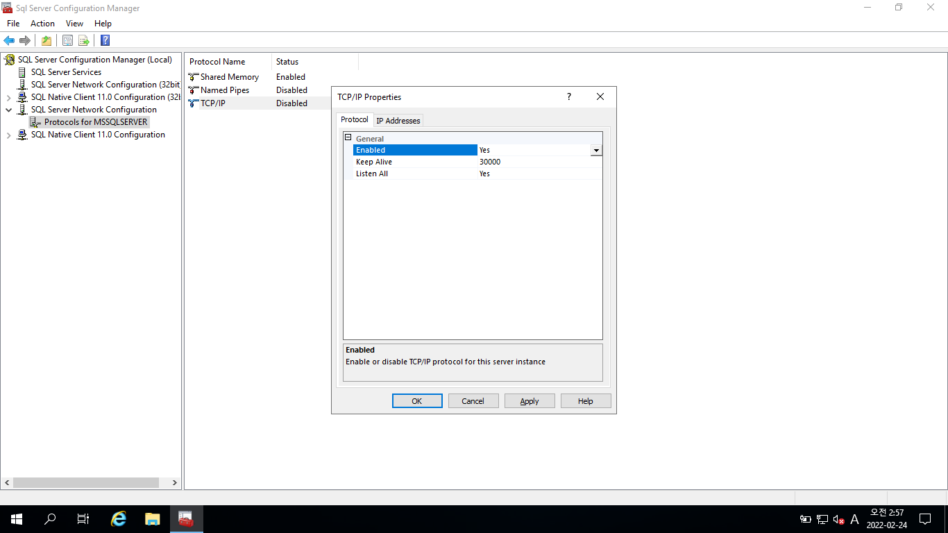 'SQL Server Network Configuration -> Protocols for MSSQLSERVER -> TCP/IP'를 Enabled로 전환합니다.