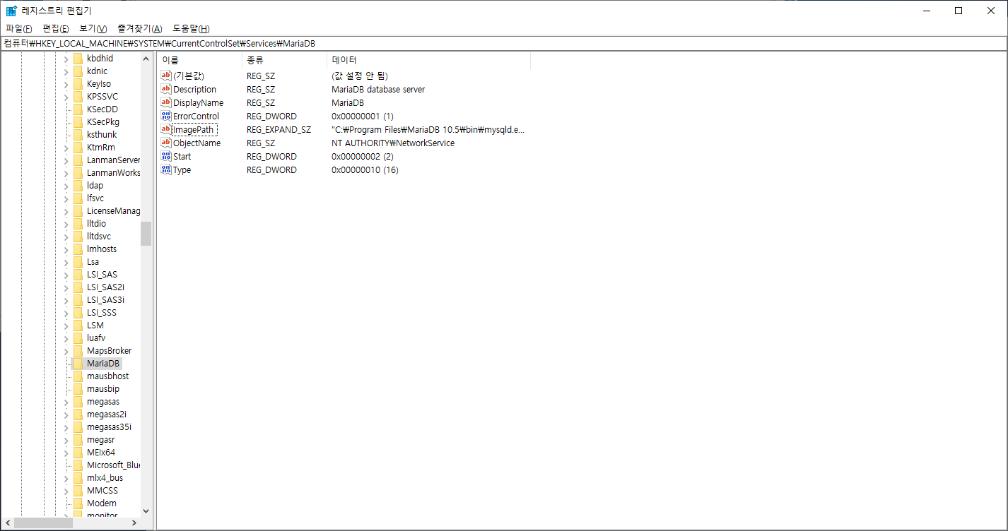 4. Regedit를 열어 '컴퓨터\HKEY_LOCAL_MACHINE\SYSTEM\CurrentControlSet\Services\MariaDB' 위치로 이동합니다.