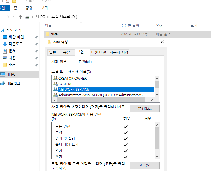5. 이동한 폴더의 권한에 NETWORK SERVICE 권한을 추가합니다.