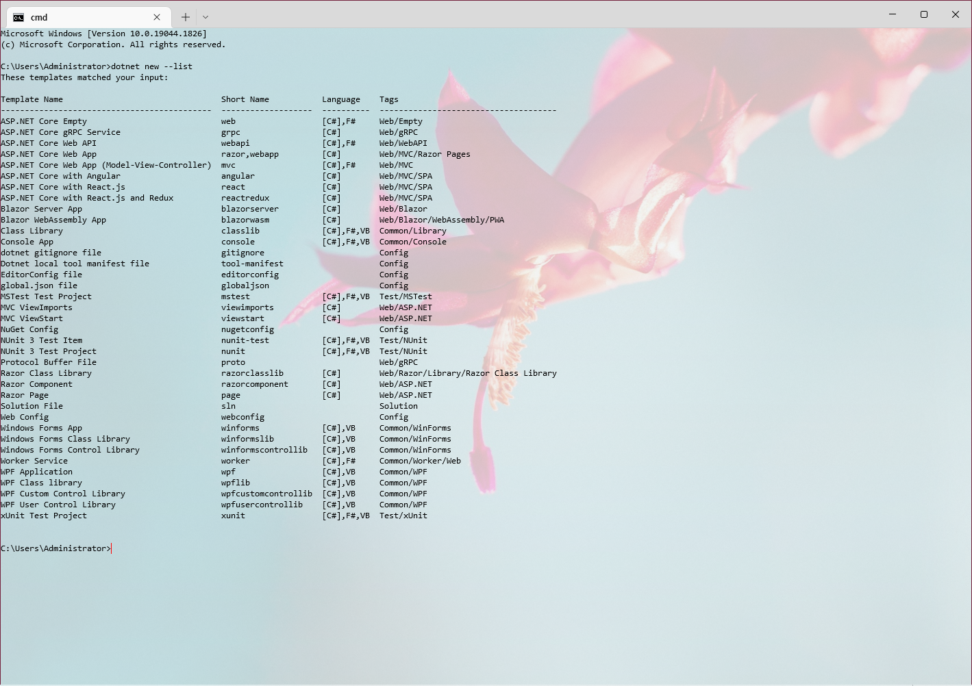 .NET SDK가 설치될 때는 다수의 프로젝트 템플릿을 같이 포함하여 설치됩니다. 명령줄에서 아래 명령을 통해 사용 가능한 프로젝트 템플릿 유형을 확인해 볼 수 있습니다.