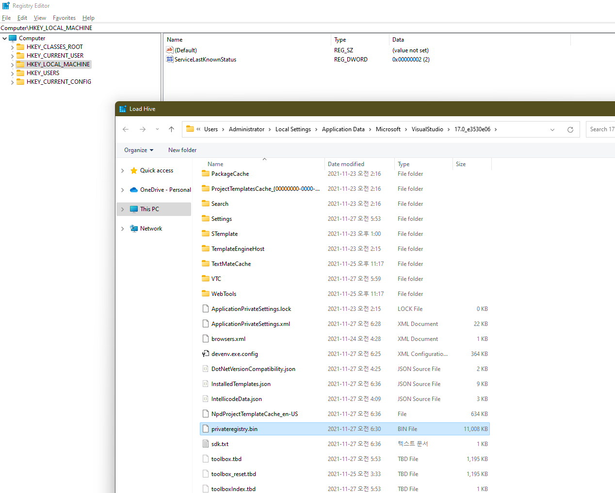 privateregistry.bin 파일에 Registry설정과 관련한 key와 value을 저장하고 Visual Studio 2022를 실행하면 해당 설정을 읽어 적용시킨 뒤 다시 Visual Studio 2022를 닫으면 그 동안의 설정을 privateregistry.bin file에 저장하는 방식으로 작동하는 것입니다.
