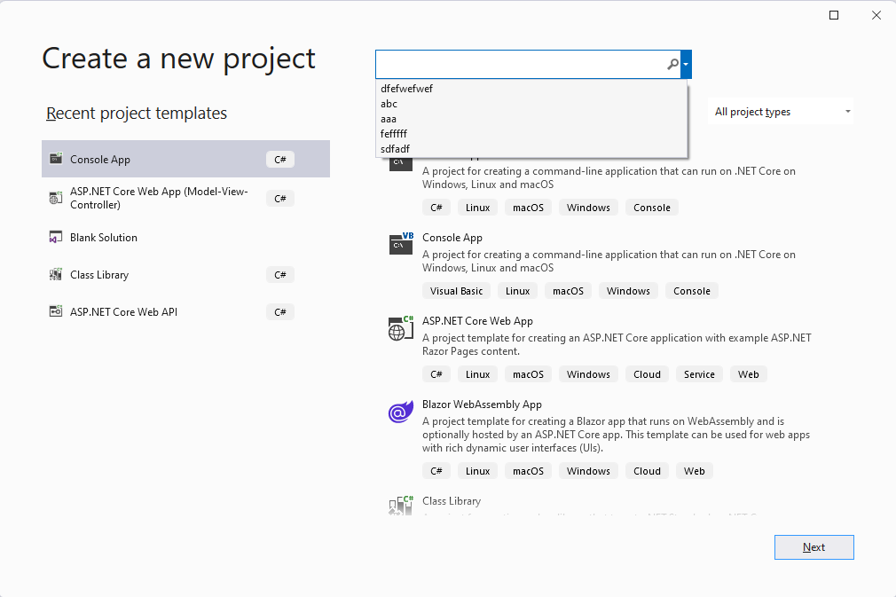 예를 들어 Visual Studio 2022에서 새로운 project를 생성할때 표시되는 'Create a new project'화면을 보면 Template을 검색하기 위해 입력했던 단어들이 표시되는걸 볼 수 있는데