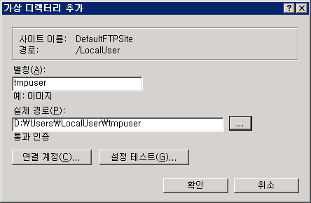 IIS관리자에서 생성한 FTP Site를 통해 LocalUser에서 Mouse오른쪽 버튼을 눌러 '가상 디렉토리 추가'를 선택하고 별칭에 tmpuser를 입력합니다. 그리고 '실제경로'에서 이전에 생성한 tmpuser Folder를 선택한 다음 '확인'을 누릅니다.