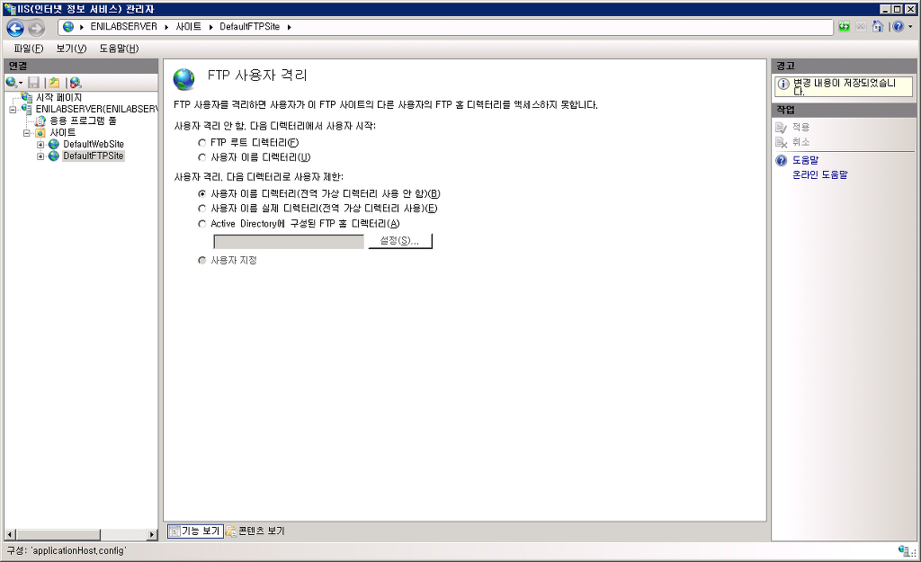 사용자 격리 설정 화면에서 '사용자 이름 디렉터리(전역 가상 디렉터리 사용 안 함)'을 선택하고 오른쪽 작업에서 '적용'을 누릅니다. 이렇게 설정하면 tmpuser는 tmpuser라는 Folder이외에 그 상위 다른 Directory는 사용할 수 없게 됩니다. 만일 최상위 Folder를 누구든 접근할 수 있는 공용으로 지정하고 그 하위에 각 사용자 별로 특정공간을 제공해야 한다면 '사용자 이름 실제 디렉터리(전역 가상 디렉터리 사용)'을 선택하도록 합니다.