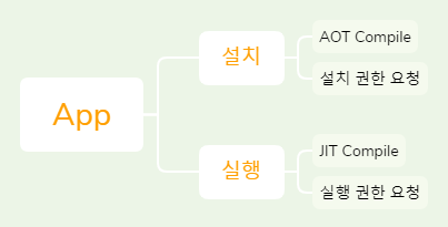 그런데 App을 설치하고 실행하는 가정에서 App은 2번의 Compile과정을 거치게 됩니다. 첫 번째는 App을 설치할 때 발생하는 AOT(Ahead of Time) Compile입니다. 이때는 App을 Linux에서 실행 가능한 형태로 만들기 위해 Compile 하는 단계에 해당하며 설치하는 과정이기 때문에 설치에 필요한 권한을 요청하고 이를 함께 처리하게 됩니다.