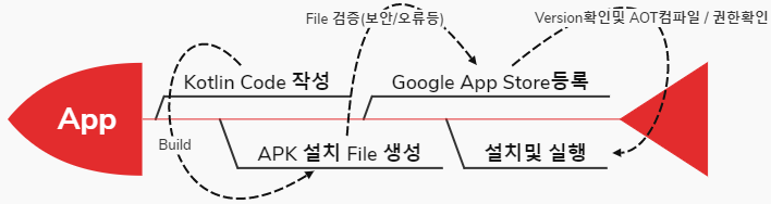 App의 개발과 실행에 관한 전체적인 흐름을 간단히 설명드리면 우선 처음 Kotlin으로 App을 만들기 위해 Code를 작성하고 이를 APK라는 설치 파일 형태로 변환합니다. 이때 Build라는 과정을 거치게 되는데 Source Code를 Android가 이해할 수 있는(실행할 수 있는) 실행파일로 변환시키는 것을 의미합니다. Build와 Compile의 차이를 간단히 말씀드리면 Compile은 단순히 기계어로 변환하는 것을 의미하지만 Build는 변환 + 실행에 필요한 Library와의 결합과정을 포함합니다.