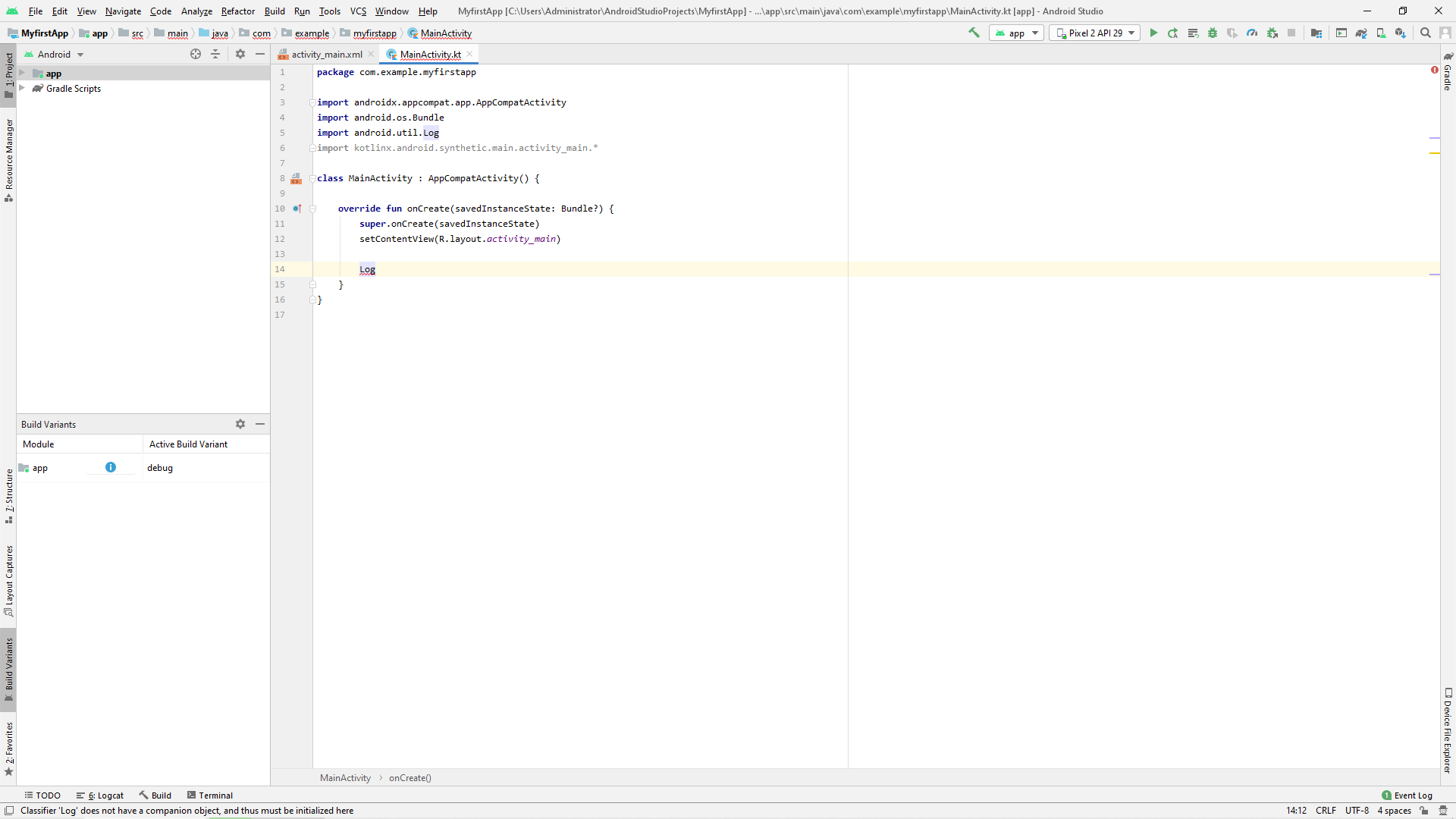 Log를 입력하고 나면 보시는 바와같이 글자가 붉은색으로 표시되며 이를 클릭하면 Log위에 'android.util.log? Alt+Enter'라는 메시지가 보이게 됩니다. 이는 Log클래스가 Import 되지 않았기 때문인데 안내에 따라 Alt + Enter키를 눌러 Import 시켜주면 됩니다.