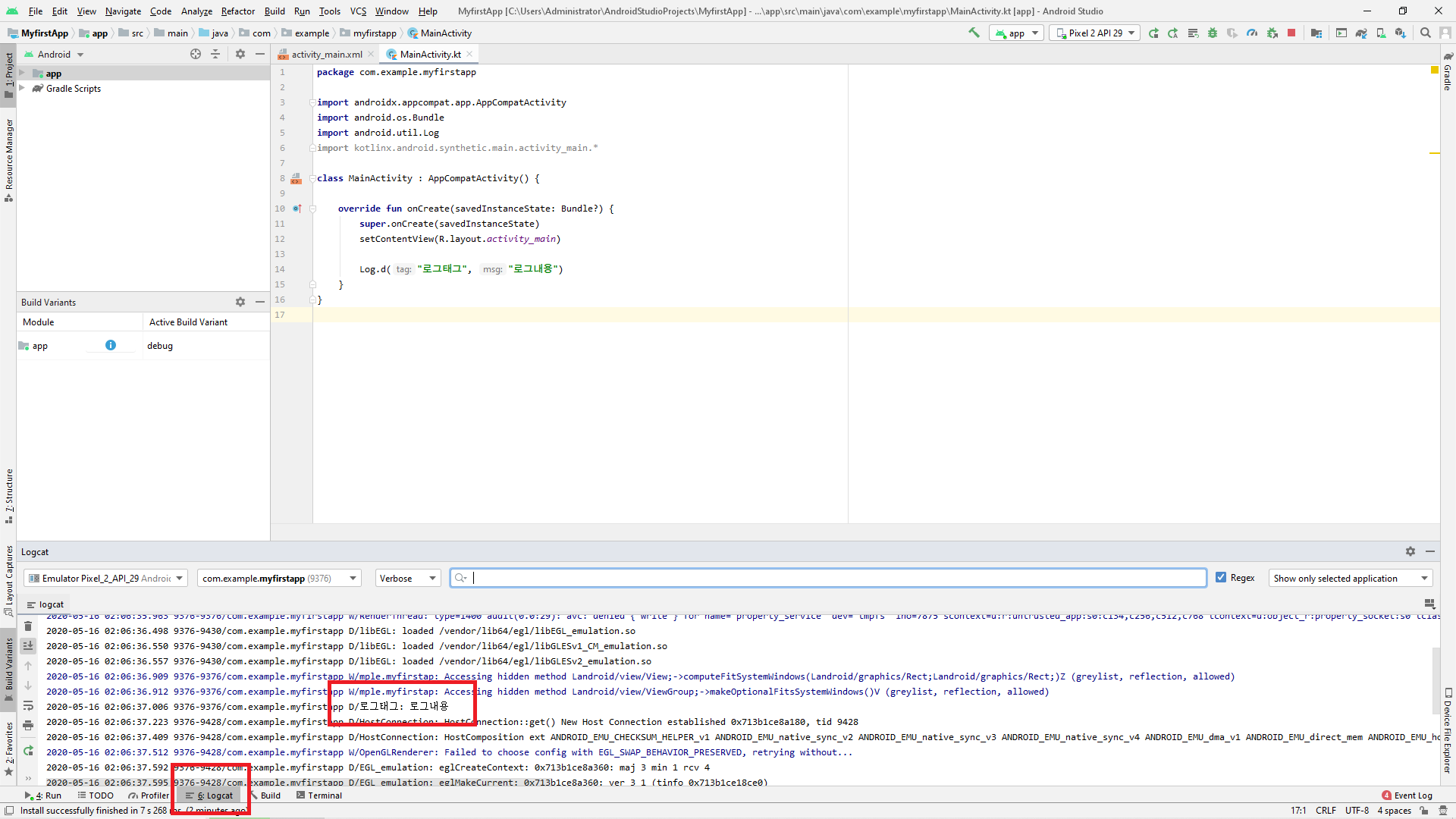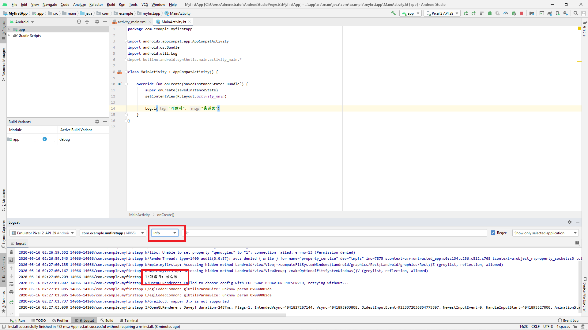 위와 같이 d함수를 사용하고 난 뒤 실제 로그를 확인해 보려면 앱을 실행 후 android studio에서 하단에 Logcat을 클릭합니다.