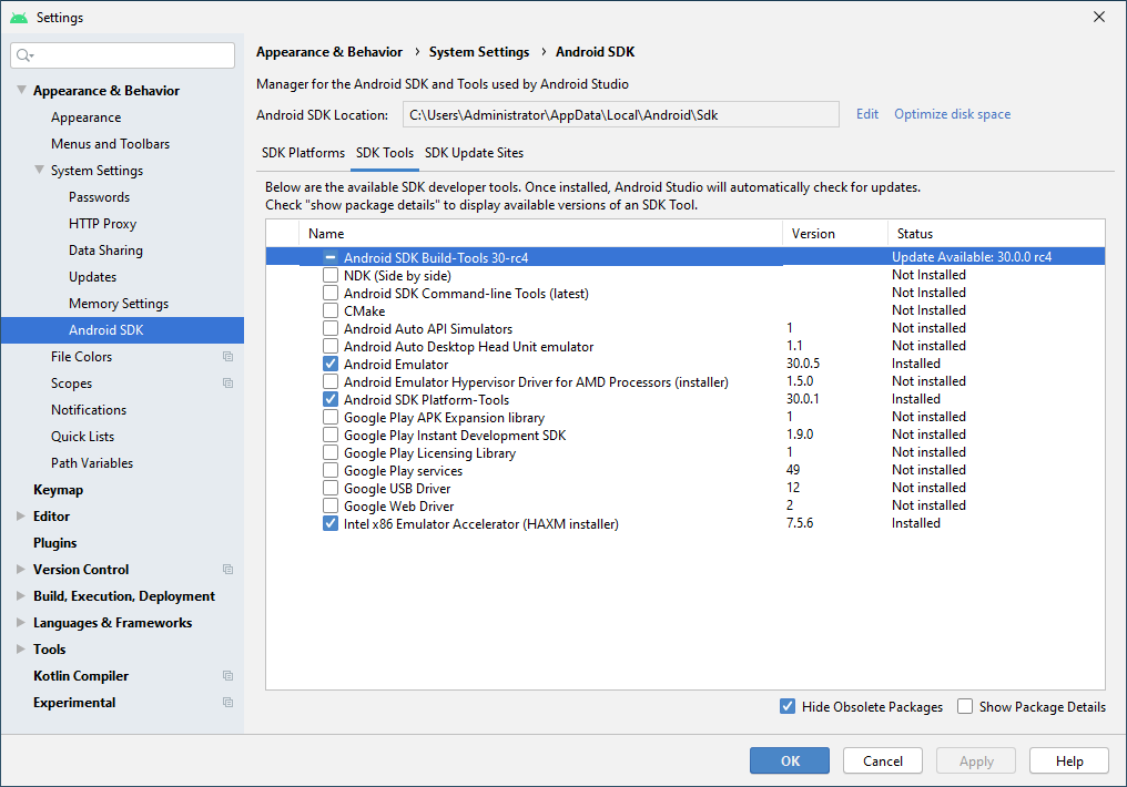 현재는 Android 에뮬레이터(가상 Android 환경) 구동을 위한 Android Emulator와 에뮬레이터의 성능 증가를 위한 Intel x86 Emulator Accelerator (HAXM installer), 그리고 Android App 개발에 필요한 각종 도구를 포함하는 Android SDK Platform-Tools가 설치되어 있음을 알 수 있습니다. 이 부분도 마찬가지로 추후 필요에 따라 선별적인 설치가 가능합니다.