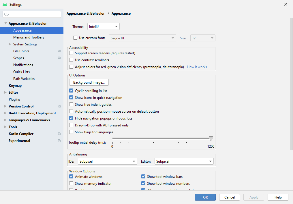 Android Studio에서 이 SDK에 관한 설정 내용을 살펴보려면 File -> Settings를 선택합니다.