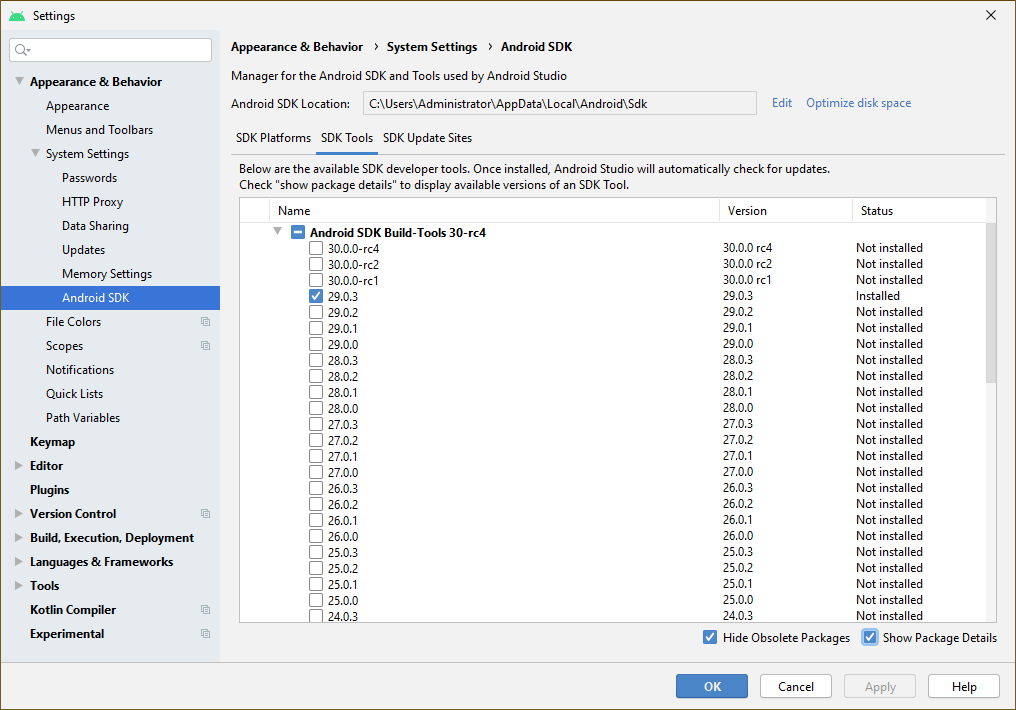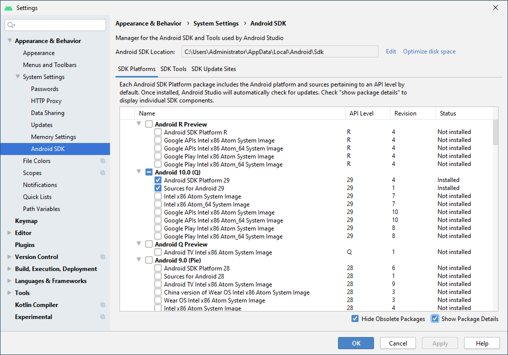 여기서 Android SDK에 관한 전체적인 설정 사항을 확인할 수 있습니다. Android SDK Location은 현재 Android SDK가 설치된 경로를 보여주고 있으며 그 아래 SDK Platforms를 통해 App을 빌드하는 데 사용되는 Android Platform이 표시되고 있습니다.