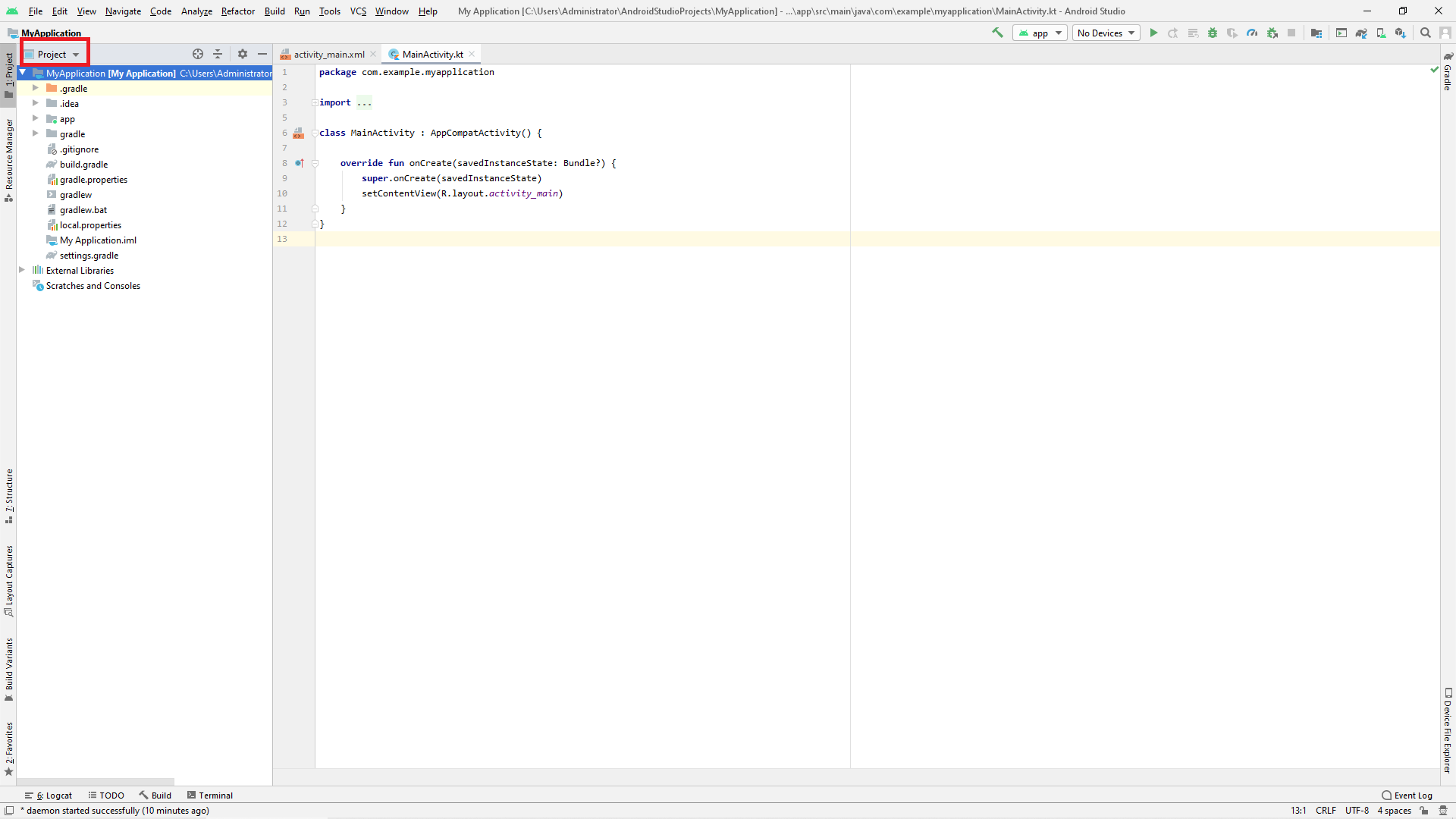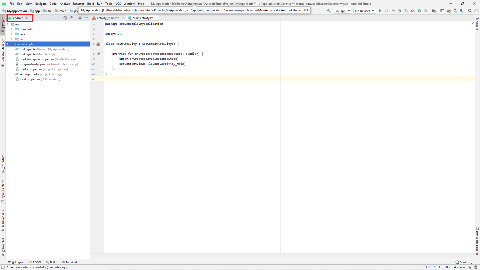 특이 왼쪽 프로젝트 구조에 주목해 주세요. 해당 창의 상단에 있는 Android는 현재 Android 프로젝트의 구조를 보여주고 있음을 의미합니다.
