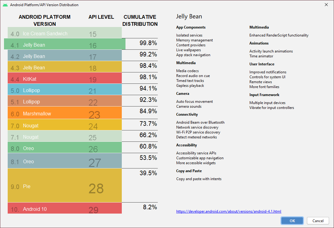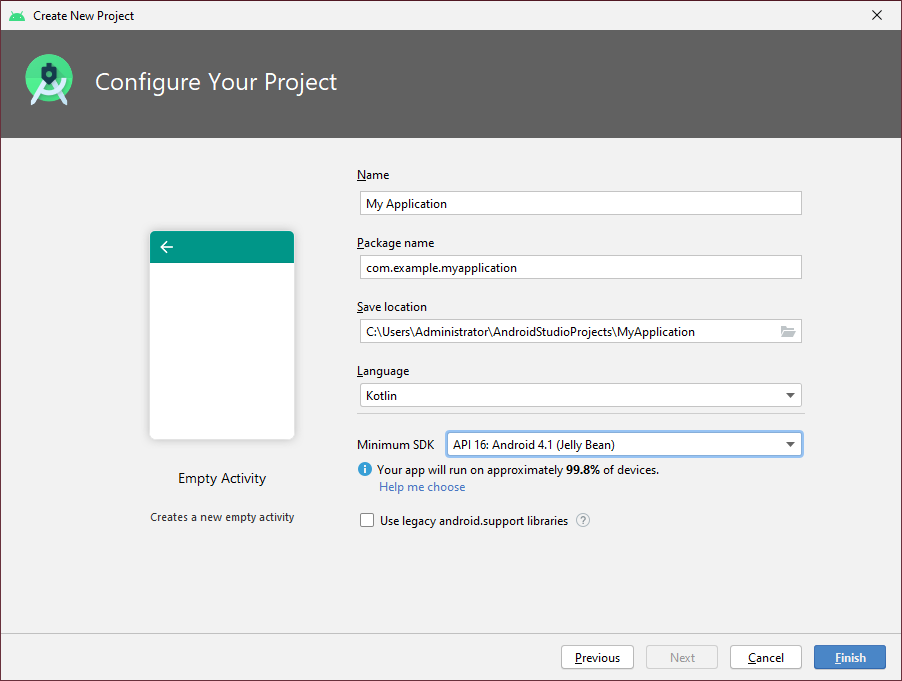 Minimum SDK에서 개발할 Android버전을 지정할 수 있습니다. 그러면 아래에 App이 동작 가능한 장치의 비율이 표시됩니다. 글을 쓰는 시점에 API 16: Android 4.1 (Jelly Bean)의 경우 99.8%의 장치에서 App을 구동할 수 있다고 합니다.
