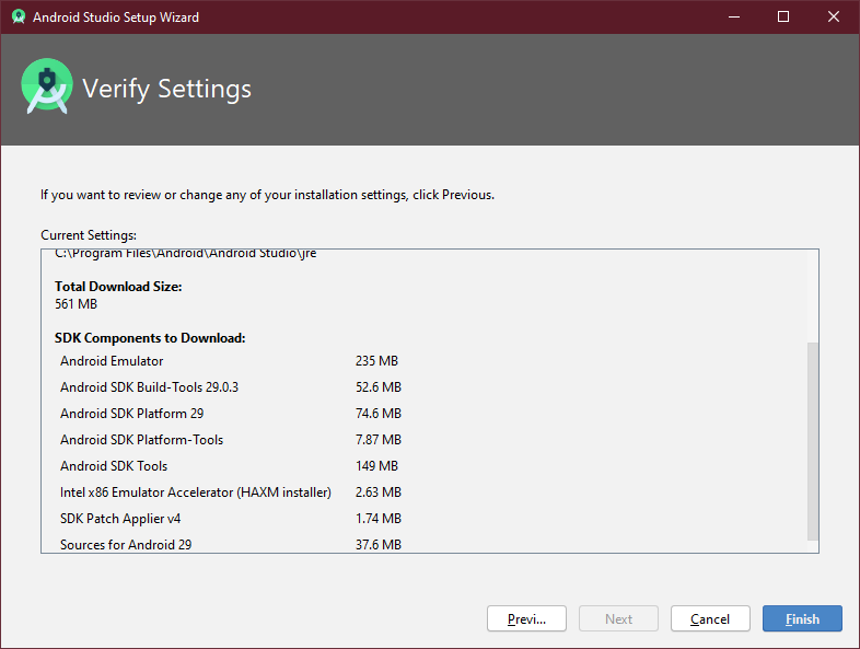 'Finish'를 누르면 위 목록의 컴포넌트들을 설치하게 됩니다.