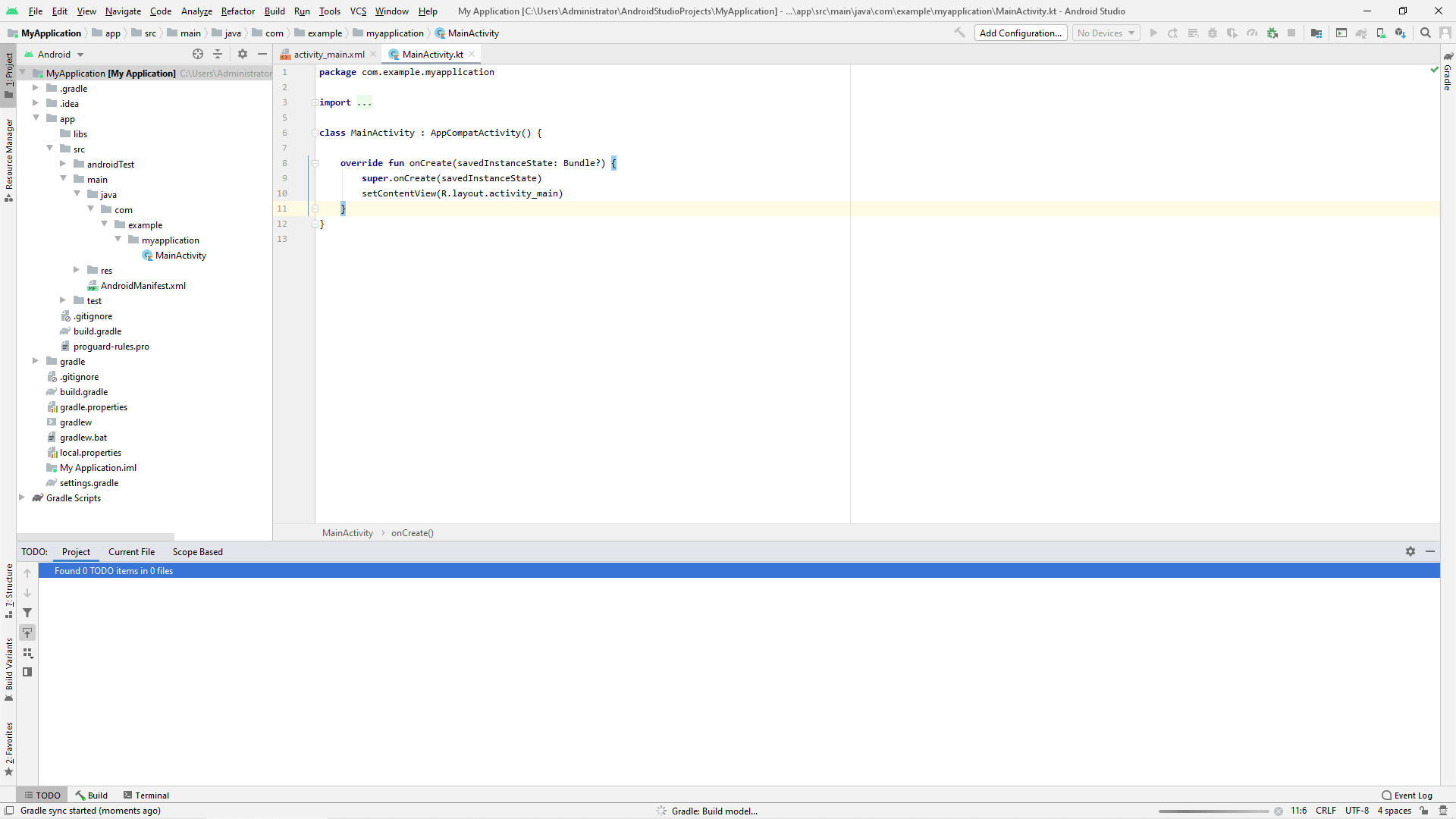 정상적으로 실행된다면 위와 같은 화면을 볼 수 있습니다. 제일 상단에 메뉴가 있고 왼쪽에 프로젝트의 전체적인 구조가 트리 형태로 표시되고 있습니다. 오른쪽에는 코드를 직접 작성할 수 있는 코드 창이 그리고 아래에는 로그나 빌드, 터미널을 실행하는 도구 창이 있습니다.