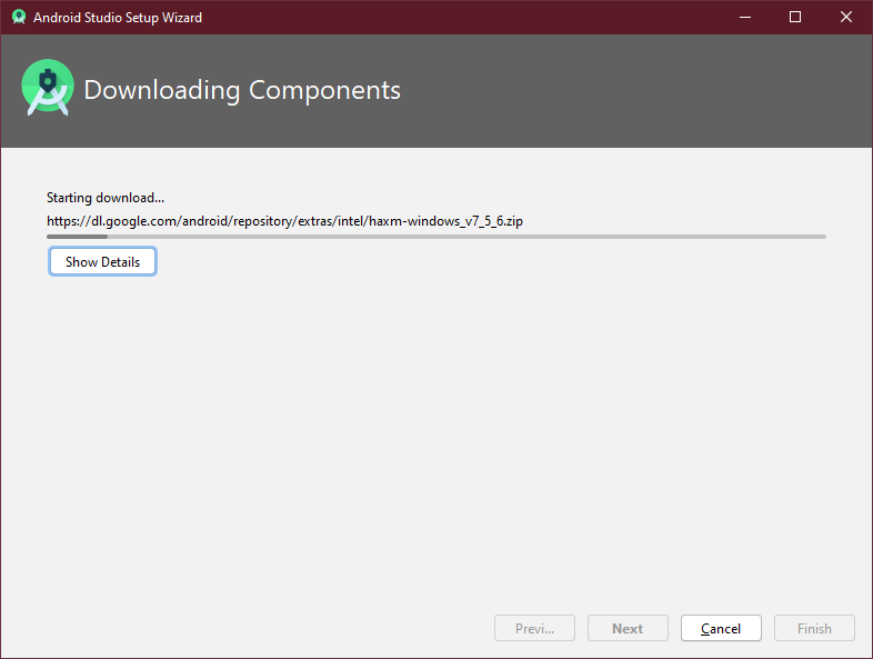 컴포넌트 설치를 시작합니다. 시간이 다소 걸릴 수 있으며 설치 중 Intel HAXM 설치와 관련해서 사용자 계정 컨트롤 화면이 나올 수 있습니다. 그때는 '예'를 선택해 줍니다.