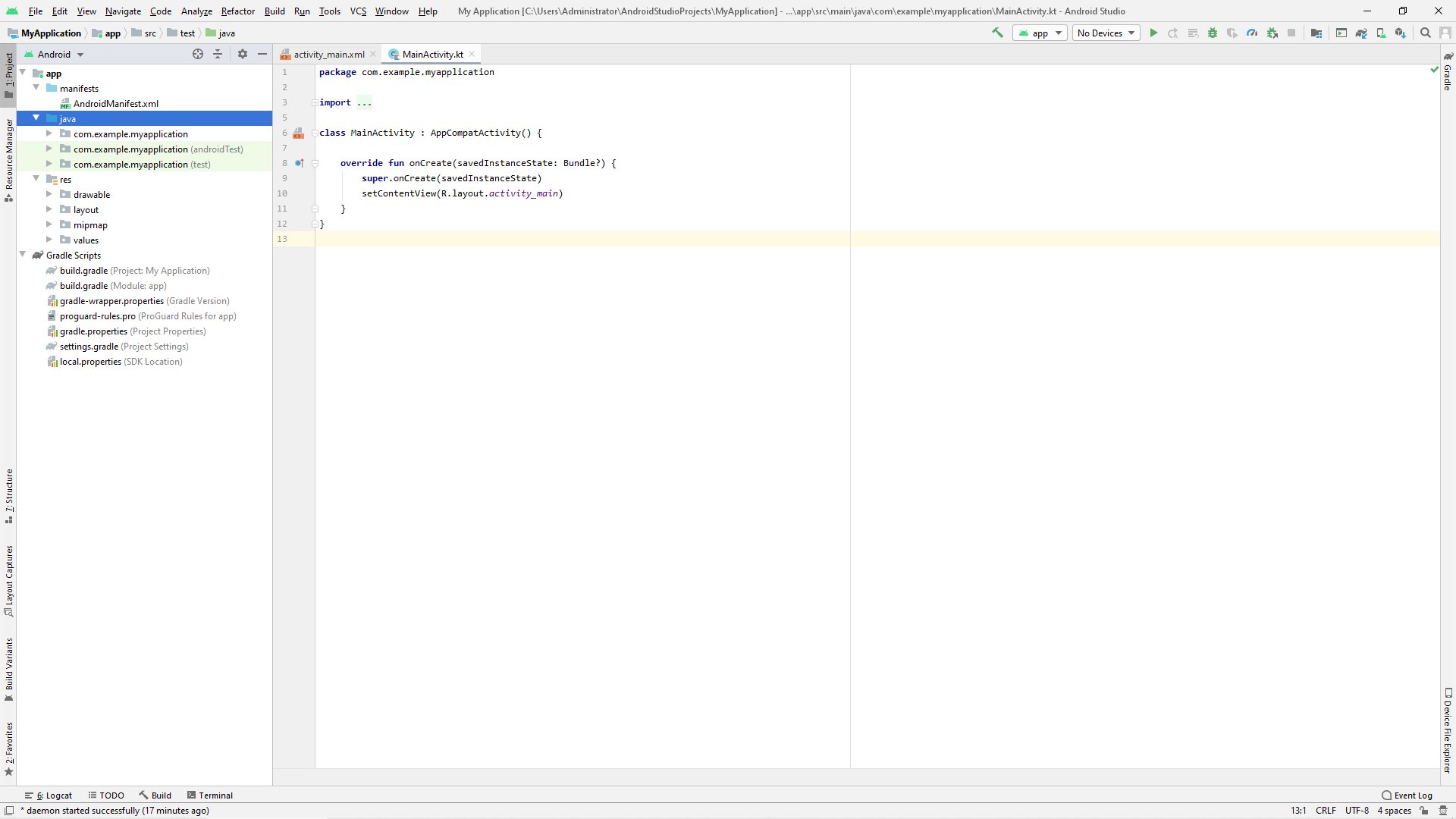 특이 왼쪽 프로젝트 구조에 주목해 주세요. 해당 창의 상단에 있는 Android는 현재 Android 프로젝트의 구조를 보여주고 있음을 의미합니다.