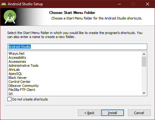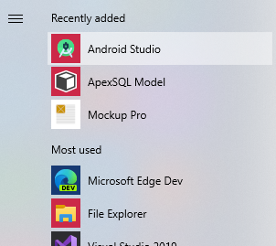 윈도의 시작 메뉴로 가면 위와 같이 Android Studio 실행 아이콘이 만들어져 있는 걸 확인할 수 있습니다. 해당 아이콘을 클릭해 Android Studio를 시작합니다.