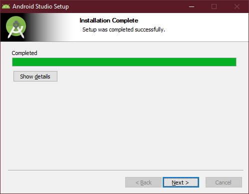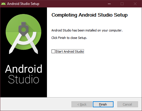 Start Android Studio를 체크 해제하고 'Finish'를 선택합니다. 이제 설치가 모두 완료되었습니다.