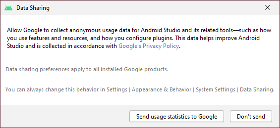 Android Studio와 관련된 데이터 수집 동의여부 화면입니다. 동의하면 'Send usage statistics to Google'을 동의하지 않으면 'Don't send'를 선택합니다.