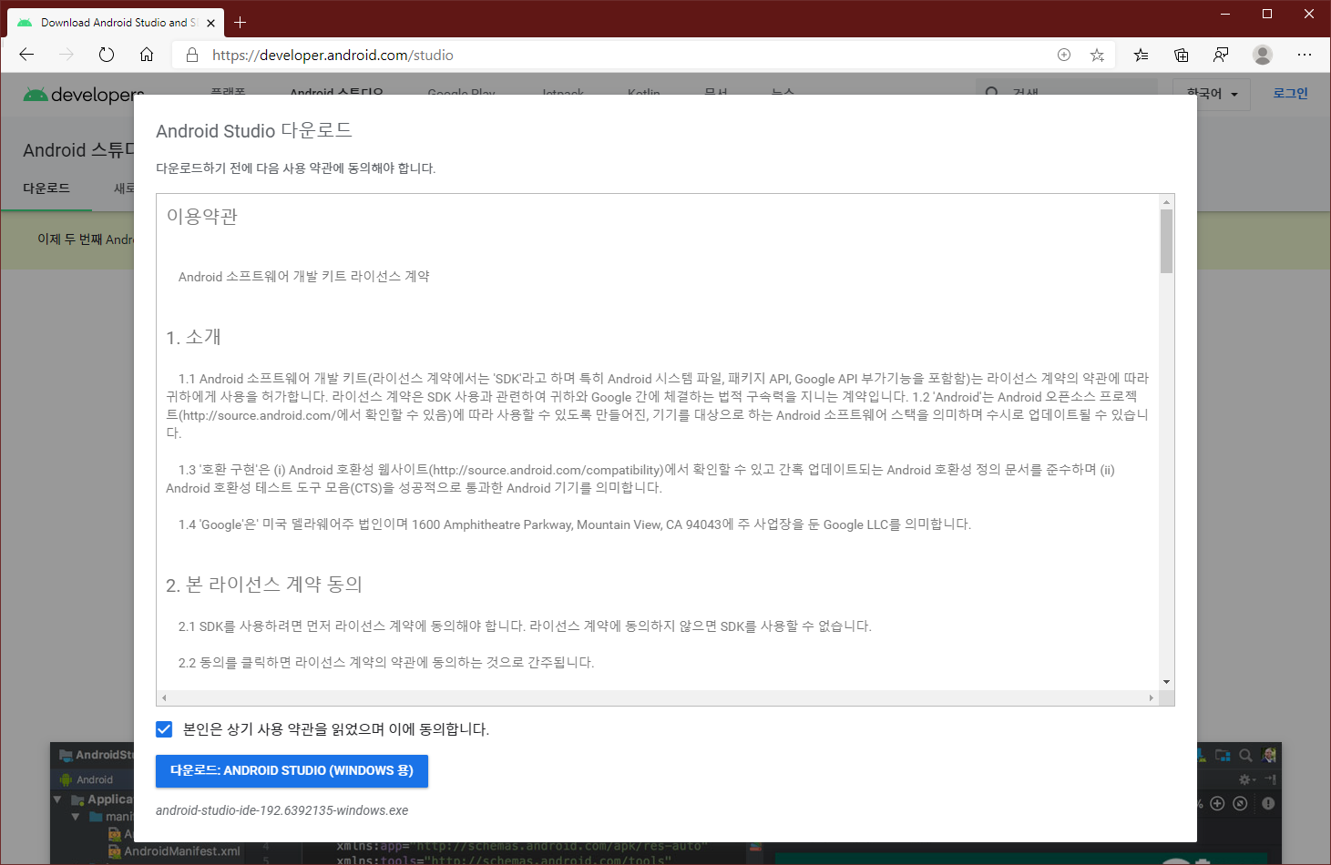 약관 동의를 하고 '다운로드: ANDROID STUDIO (WINDOWS 용)'을 눌러주세요. Android Studio는 Mac과 Linux용을 따로 배포하고 있으니 운영체제에 맞게 내려받아야 합니다.