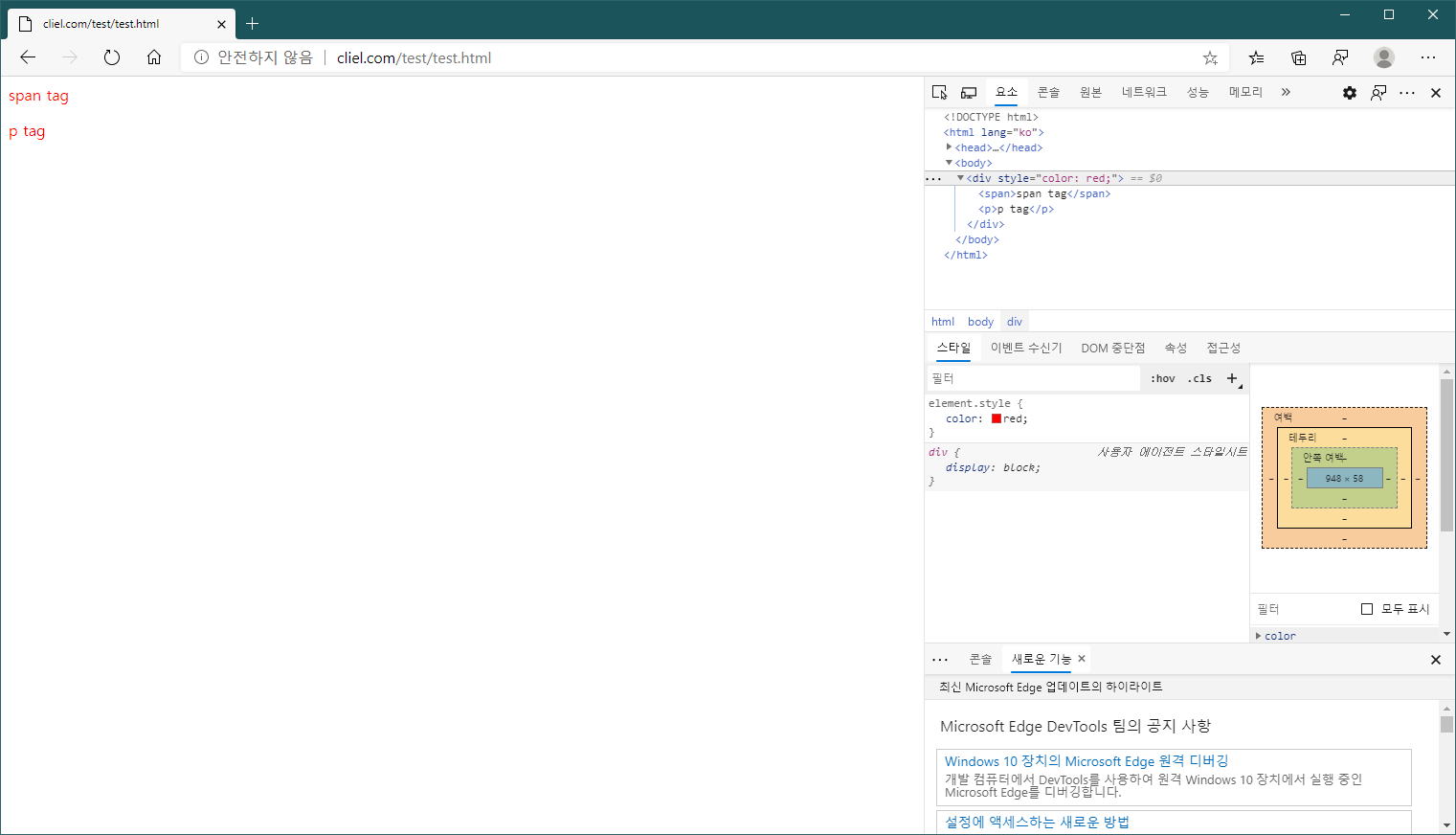 따라서 위 예제의 경우 body의 자손은 div가 되고 후손은 div와 span, p가 됩니다. 또한 span과 p는 div의 자손에 해당합니다.