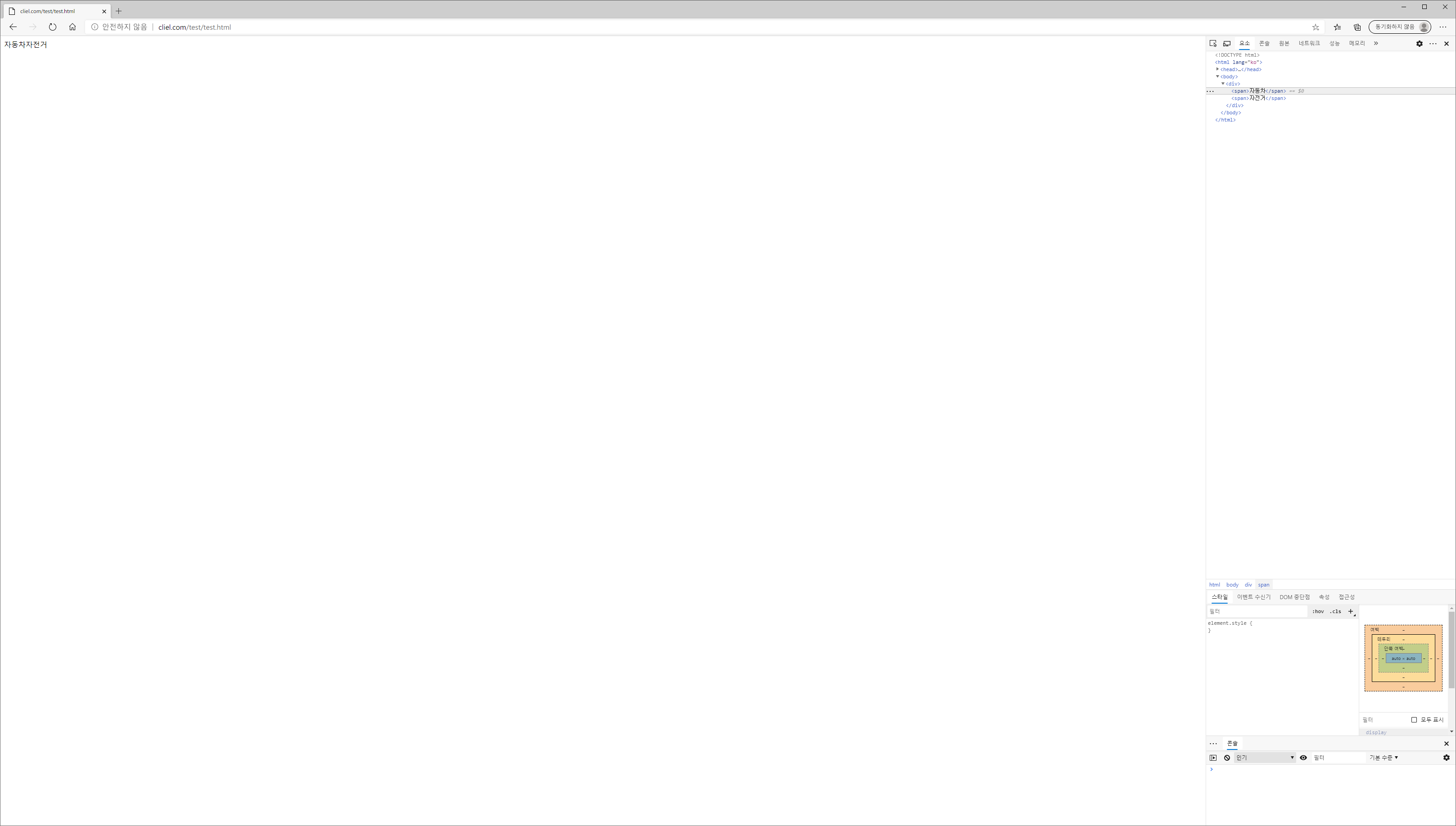 생성한 요소도 하나의 요소이므로 사용가능한 모든 메서드를 사용할 수 있습니다. 아래 예제는 span요소를 생성하고 내부에 '자동차'라는 내용을 추가하며