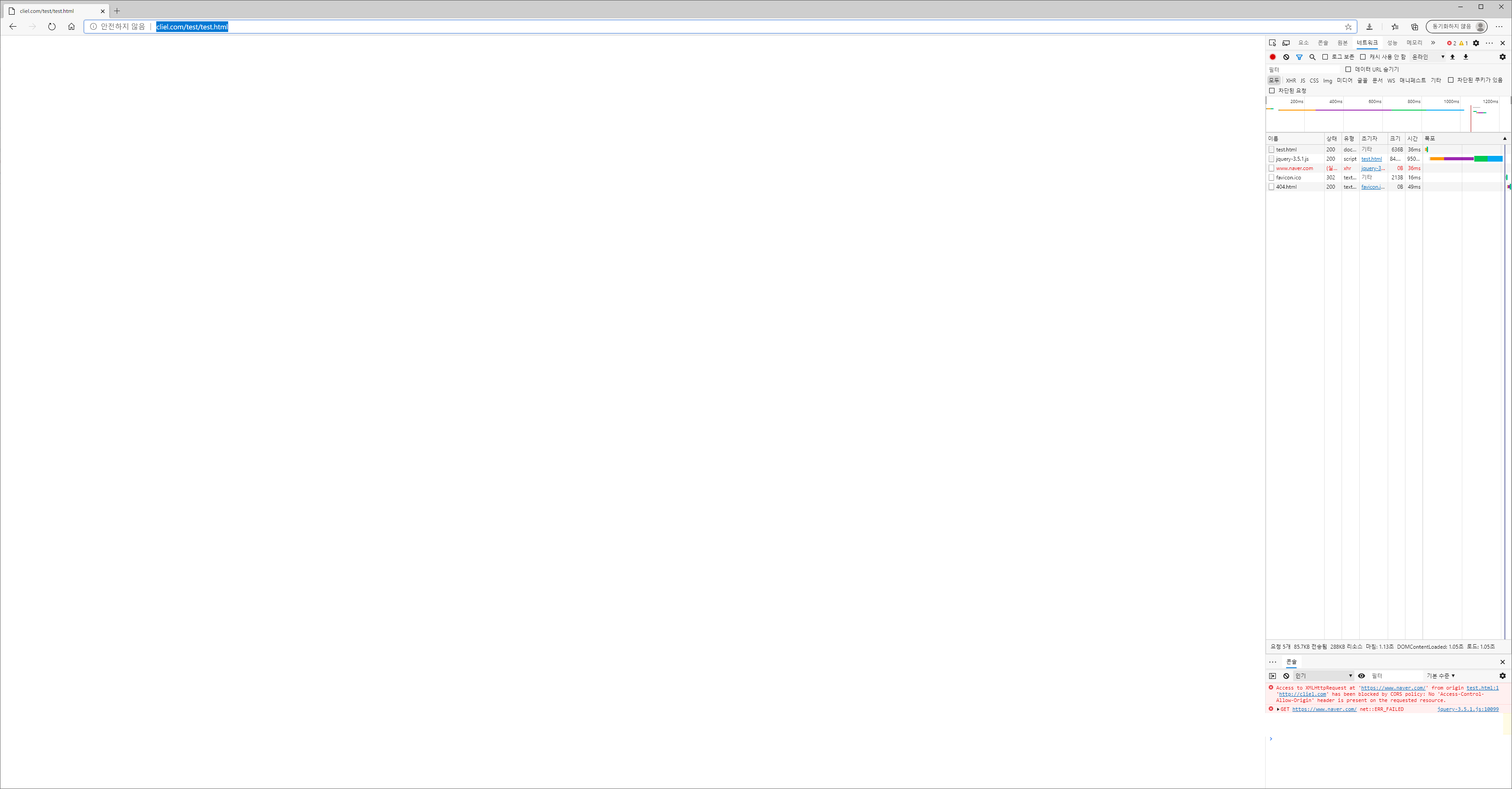 웹브라우저는 보안을 위해 현재 도메인에서 다른 도메인으로의 요청을 원칙적으로 차단하고 있습니다. 따라서 다음과 같은 시도를 하게 되면