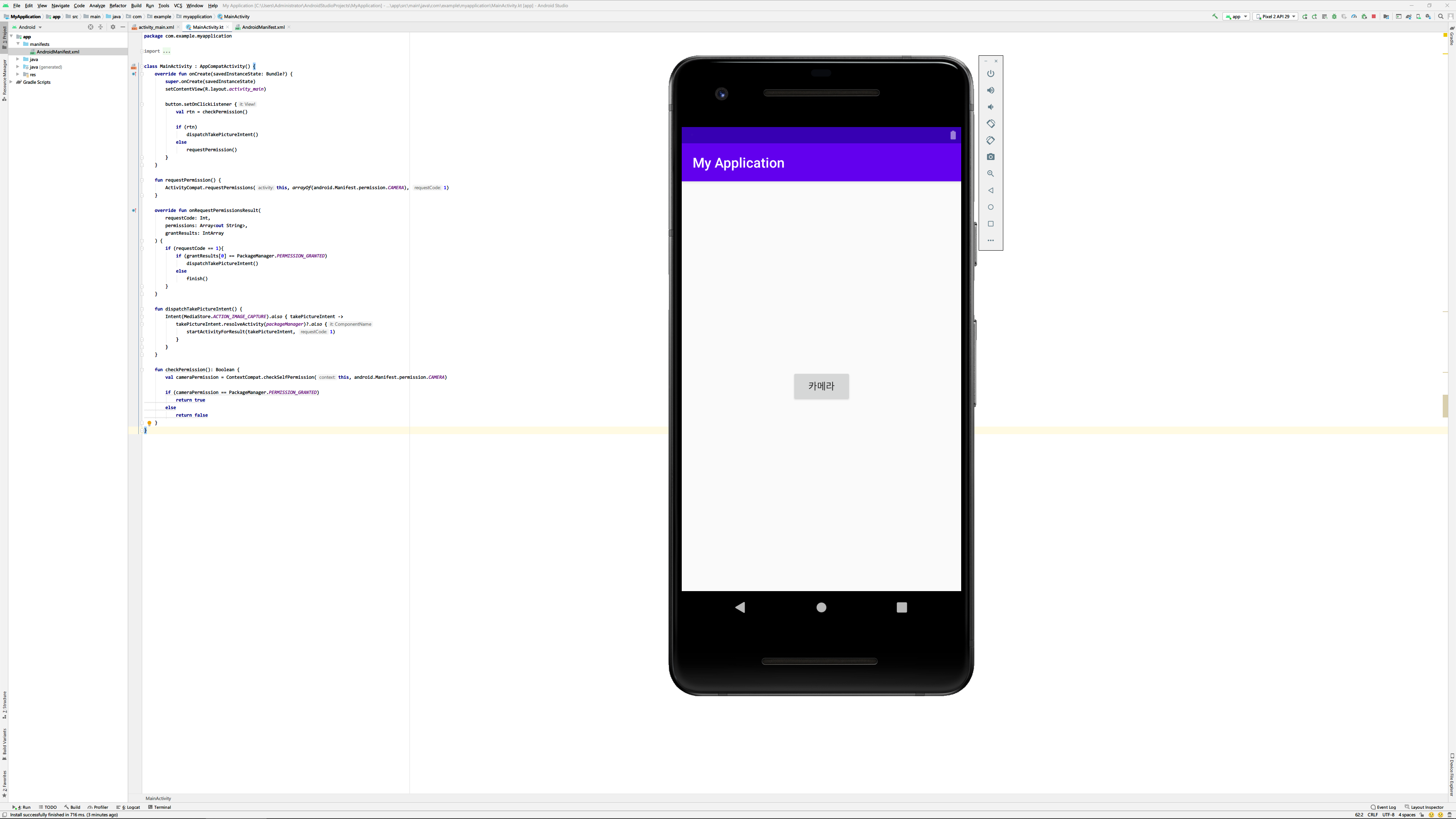 우선 다음과 같이 app -> manifests에 있는 AndroidManifest.xml파일을 열어 다음과 같이 user-permission태그를 추가해 카메라 사용자 권한을 추가합니다.