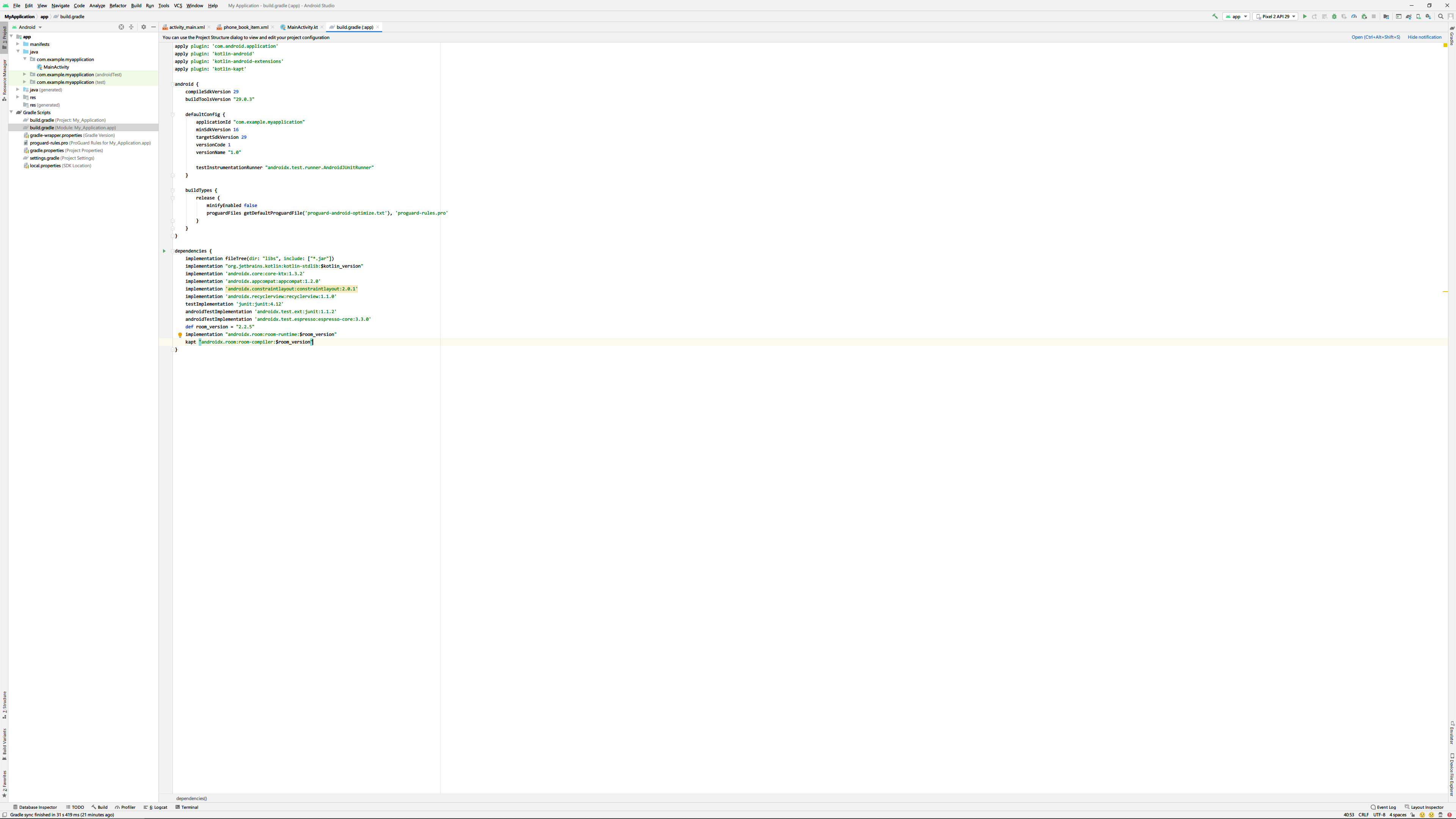 프로젝트에 ROOM라이브러리를 추가하기 위해 Gradle Scripts -> build.gradle(Module...) 파일을 연뒤 상단에 다음과 같은 내용을 추가합니다.