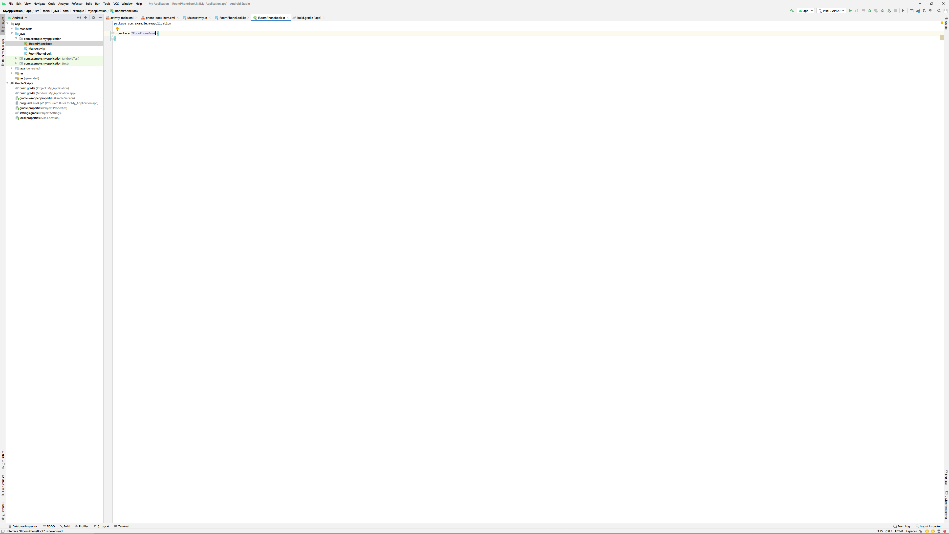 app -> java -> [패키지명]에서 마우스 오른쪽 버튼을 눌러 New -> Kotlin File/Class를 선택한 뒤 이어지는 화면에서 interface를 선택하고 이름을 IRoomPhoneBook로 입력해 interface파일을 생성합니다.